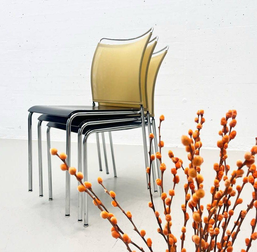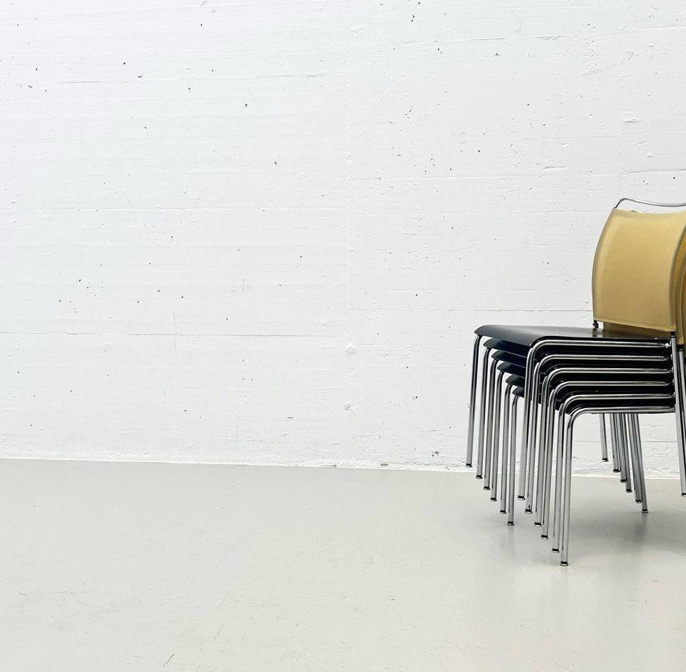 Die Stühle zeichnen sich durch ihre filigrane und funktionale Konstruktion aus: Sitzflächen aus schwarzem Formholz ruhen auf einem leichten, stapelbaren Gestell aus verchromtem Stahlrohr.
