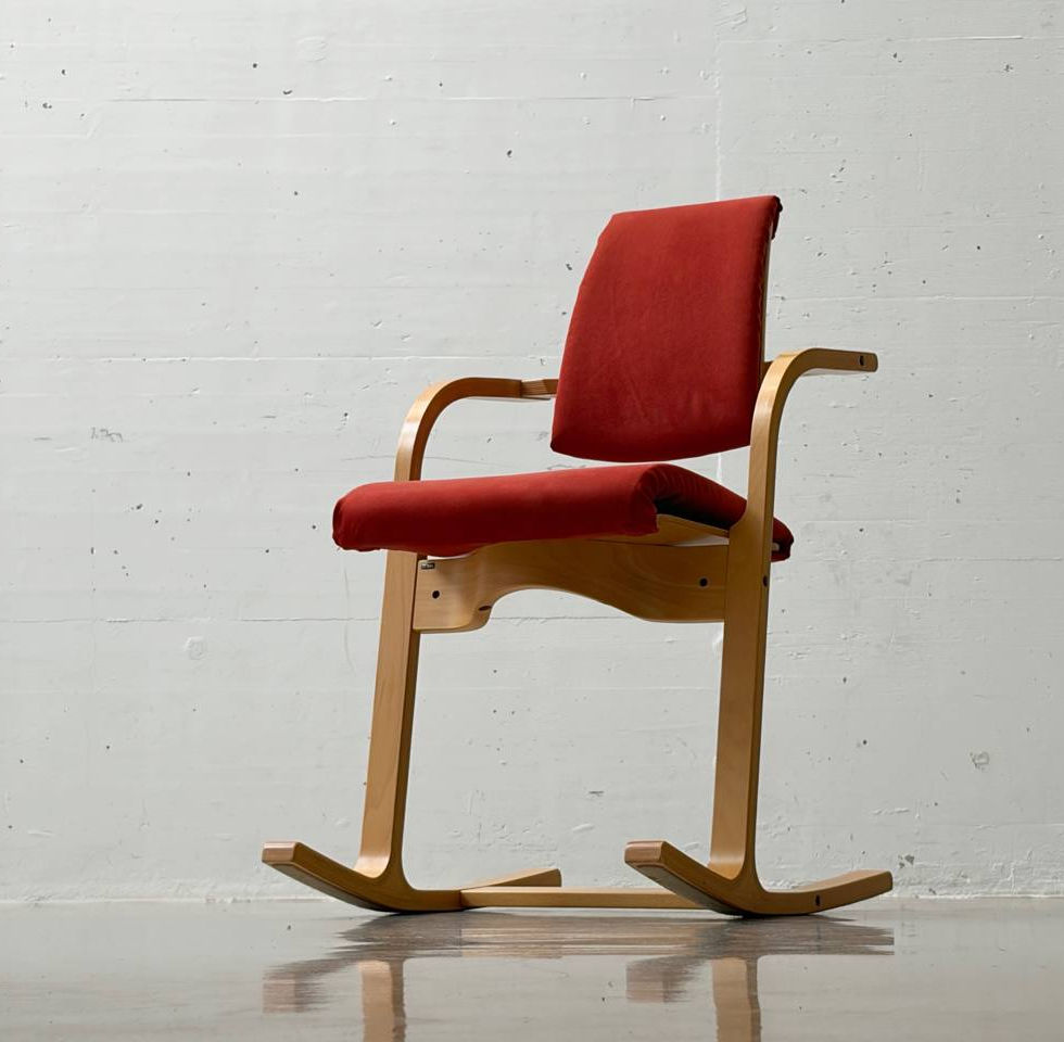 Stokke ist ein weltweit bekannter Hersteller für seine ergonomischen und komfortablen Möbel. Bei diesen Stühlen handelt es sich um Skandinavische Stücke, entworfen von Peter Opsvik, der auch den ikonischen Tripp Trapp-Stuhl für Kinder entworfen hat. Die Stühle haben ein Gestell aus Buche und einen rotem Stoff. Opsvik hat sich schon immer für die menschliche Anatomie und Physiologie interessiert, und seine ergonomischen Stühle sind das Ergebnis seiner eingehenden Forschungen zu den natürlichen Bewegungen des Körpers und den Anforderungen an die Unterstützung der Wirbelsäule. Seine Kreationen wurden mit zahlreichen internationalen Designpreisen ausgezeichnet und sowohl im Arbeits- als auch im Freizeitbereich häufig eingesetzt.
