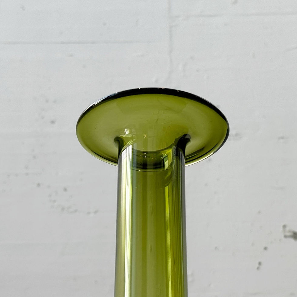 Elegante, hochgewachsene Glasvase in einer charakteristischen Formensprache der 1970er Jahre, geprägt von einem langen, schlanken Hals und einem weich gerundeten Korpus. Die Vase überzeugt durch ihren subtilen Farbverlauf in sattem Olivgrün, der sich zum Fuss hin verdichtet und in einem massiven, klaren Standring ausläuft. Der leicht ausgestellte Rand verleiht dem Objekt eine raffinierte Leichtigkeit und sorgt zugleich für eine schöne Präsentation einzelner Zweige oder floraler Arrangements. Das Zusammenspiel aus klarer Linienführung und zurückhaltender Farbgebung macht dieses Stück zu einem vielseitig einsetzbaren Designobjekt – sowohl als Solitär wie auch in Kombination mit anderen Glasarbeiten.