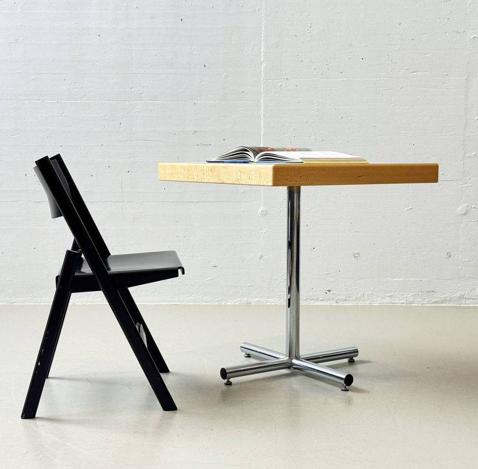 Zeitlose Bistro-Tische mit einer quadratischen Tischplatte in weissem Laminat und umlaufender Massivholzkante, ausgeführt in heller Buche. Die Kombination aus klarer Linienführung, robuster Laminatoberfläche und der natürlichen Holzmaserung verleiht den Tischen einen klassischen, funktionalen Charakter, wie er in Kantinen, Cafeterien und modernen Arbeitsumgebungen der 1970er Jahre verbreitet war. Der polierte Chromkreuzfuss sorgt für eine stabile Standfeste und verleiht den Tischen eine leichte, industrielle Note.