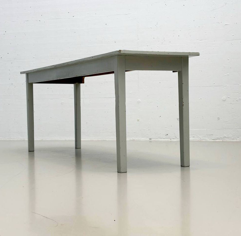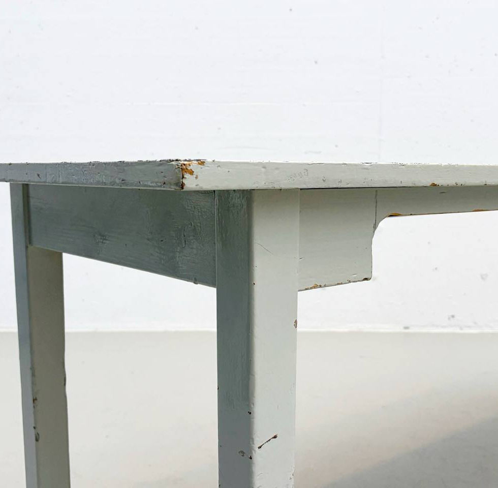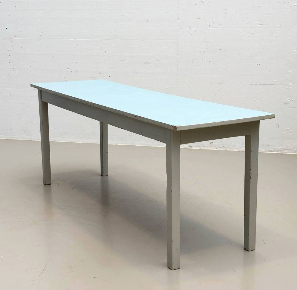 Konstruktiv ist der Tisch solide gearbeitet, mit einfachen Holzverbindungen und einer leicht überstehenden Platte. Kleine Aussparungen an den Zargen lockern das ansonsten sachliche Erscheinungsbild leicht auf. Durch seine schmale Form eignet sich der Tisch ideal als Küchentisch, Arbeitsfläche oder als Beistelltisch in Wohn- und Atelierumgebungen. Der charakteristische Farbkontrast zwischen hellblauer Platte und hellem Untergestell verleiht ihm einen nostalgischen, aber dennoch zeitlosen Ausdruck.