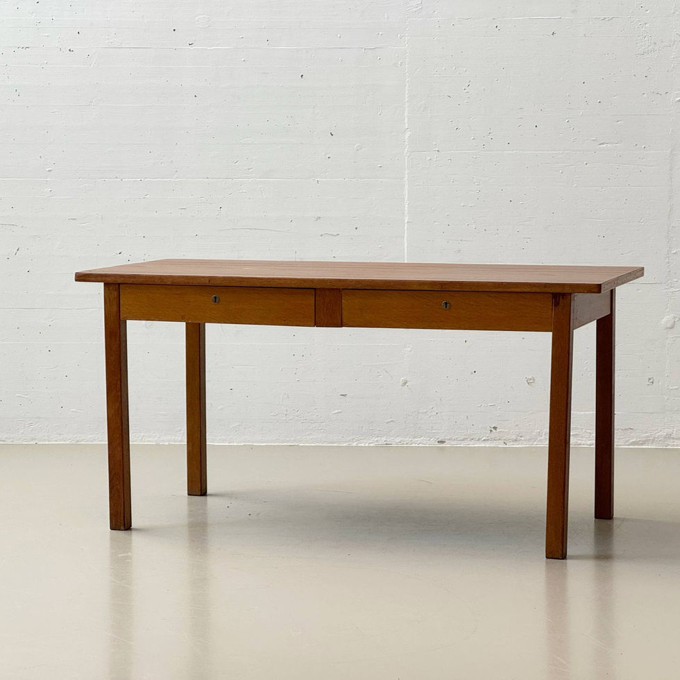 Schlichter Schreibtisch im funktionalen Design der 1970er Jahre mit klarer, zeitloser Formensprache. Der Tisch verfügt über eine rechteckige Tischplatte mit sanft gerundeten Kanten und steht auf vier schlanken, leicht nach innen versetzten Beinen. Die reduzierte Konstruktion unterstreicht den typischen Mid-Century Charakter und sorgt für eine elegante, leichte Wirkung im Raum. Unterhalb der Tischplatte befinden sich zwei integrierte Schubladen mit dezenten Schlössern, die praktischen Stauraum für Schreibutensilien oder Dokumente bieten. Die Schubladen sind sauber verarbeitet, klassisch verzinkt und laufen auf traditionellen Holzführungen.