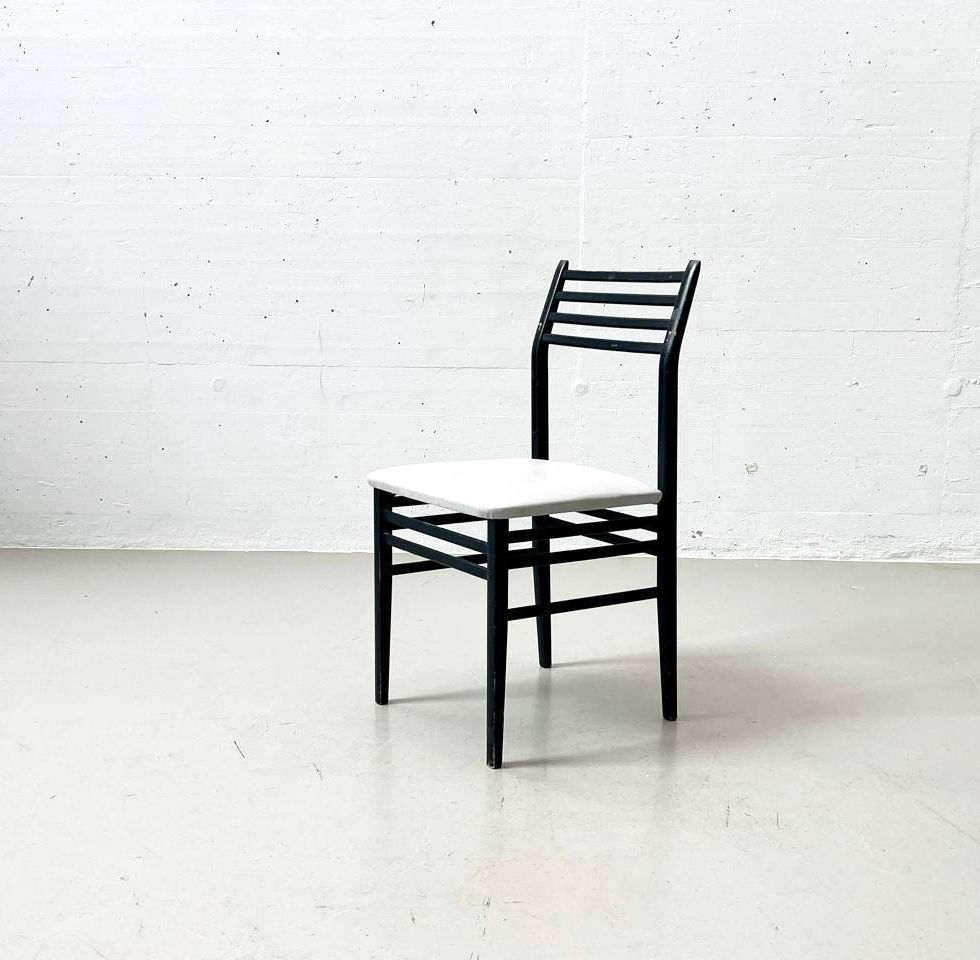 Der Stuhl ist stabil und gebrauchsfähig, weist jedoch deutliche Spuren der Zeit auf. Die schwarze Lackierung des Holzgestells zeigt Abplatzer, Kratzer und Abrieb, insbesondere an den Kanten der Rückenlehne und den unteren Streben. Das weisse Kunstleder der Sitzfläche ist intakt. Insgesamt ein authentisches Vintage-Stück mit klar erkennbarer Patina, das durch seine zurückhaltende und zugleich markante Gestaltung überzeugt.