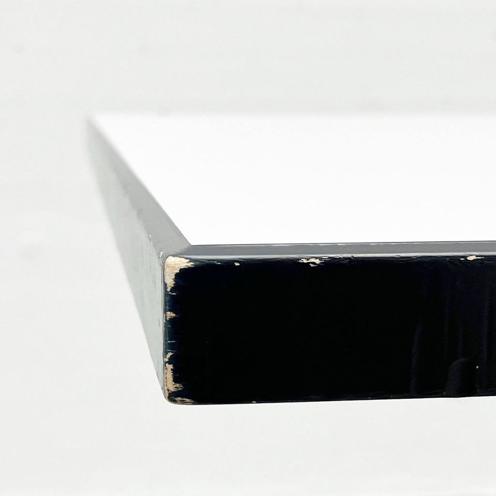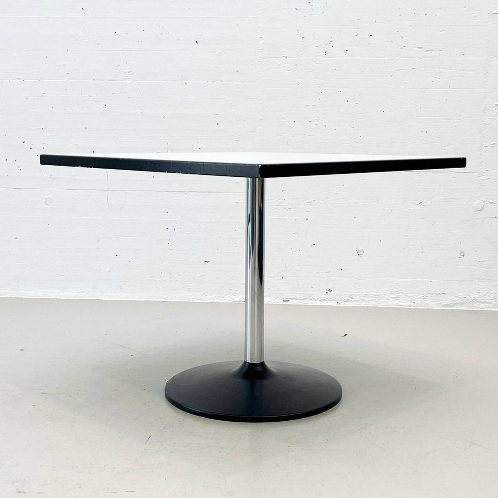 Der Tisch besitzt eine quadratische Platte mit weisser Laminatoberfläche und schwarzer Umleimung, was einen klaren, grafischen Kontrast ergibt. Getragen wird die Platte von einer zentralen, verchromten Metallsäule, die in einem schwarzen, runden Gussfuss verankert ist. Diese Kombination aus einfacher Formensprache und robusten Materialien macht den Tisch besonders vielseitig und prädestiniert ihn für Cafeterien, Restaurants oder moderne Wohnumgebungen.