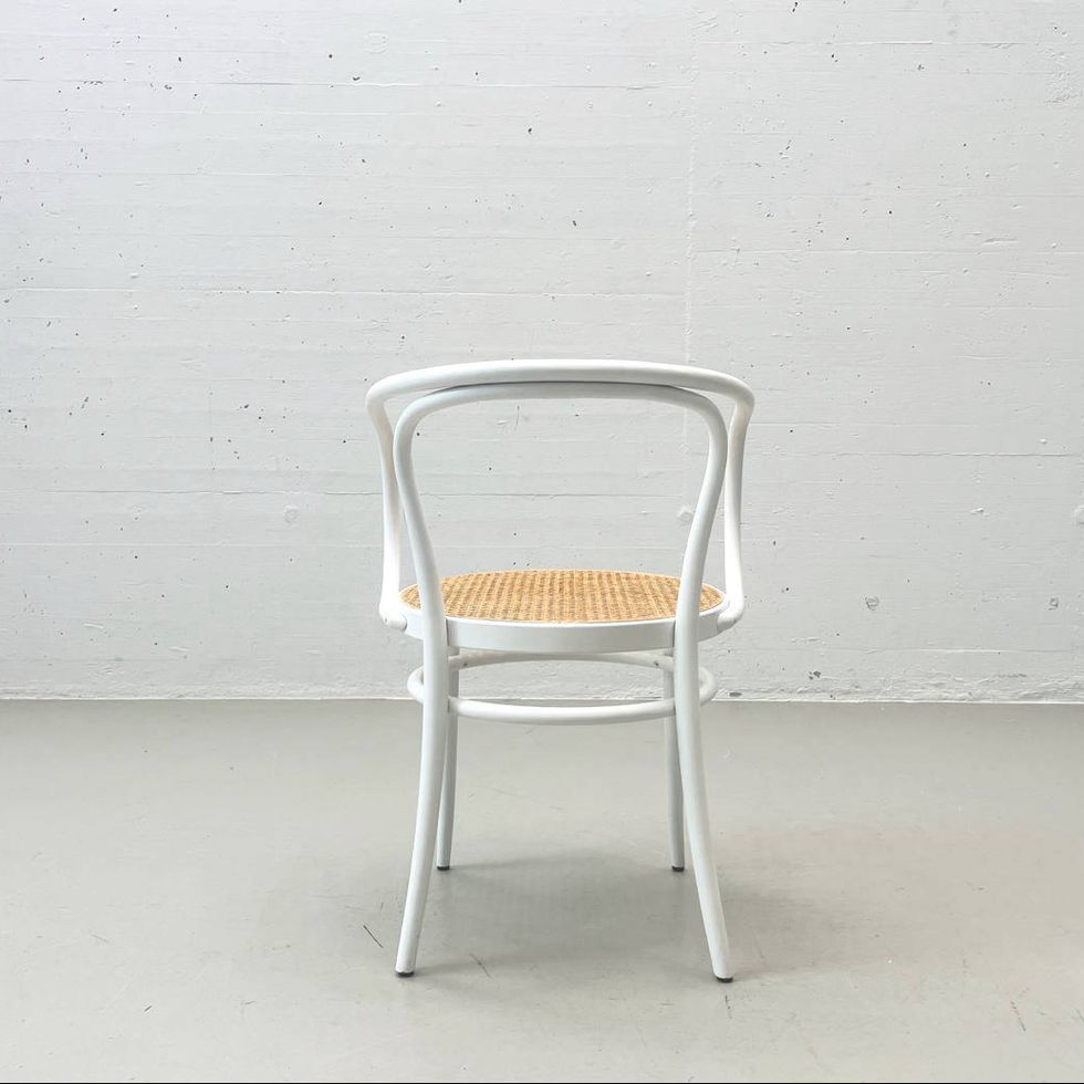 Le sedie sono realizzate con la classica tecnica Thonet di curvatura a vapore. La struttura è verniciata in bianco chiaro, una finitura che esalta il carattere leggero e contemporaneo del modello. La seduta rotonda in intreccio viennese crea un piacevole contrasto caldo con la struttura bianca. Sotto la seduta, l'anello in legno curvato garantisce stabilità e robustezza.