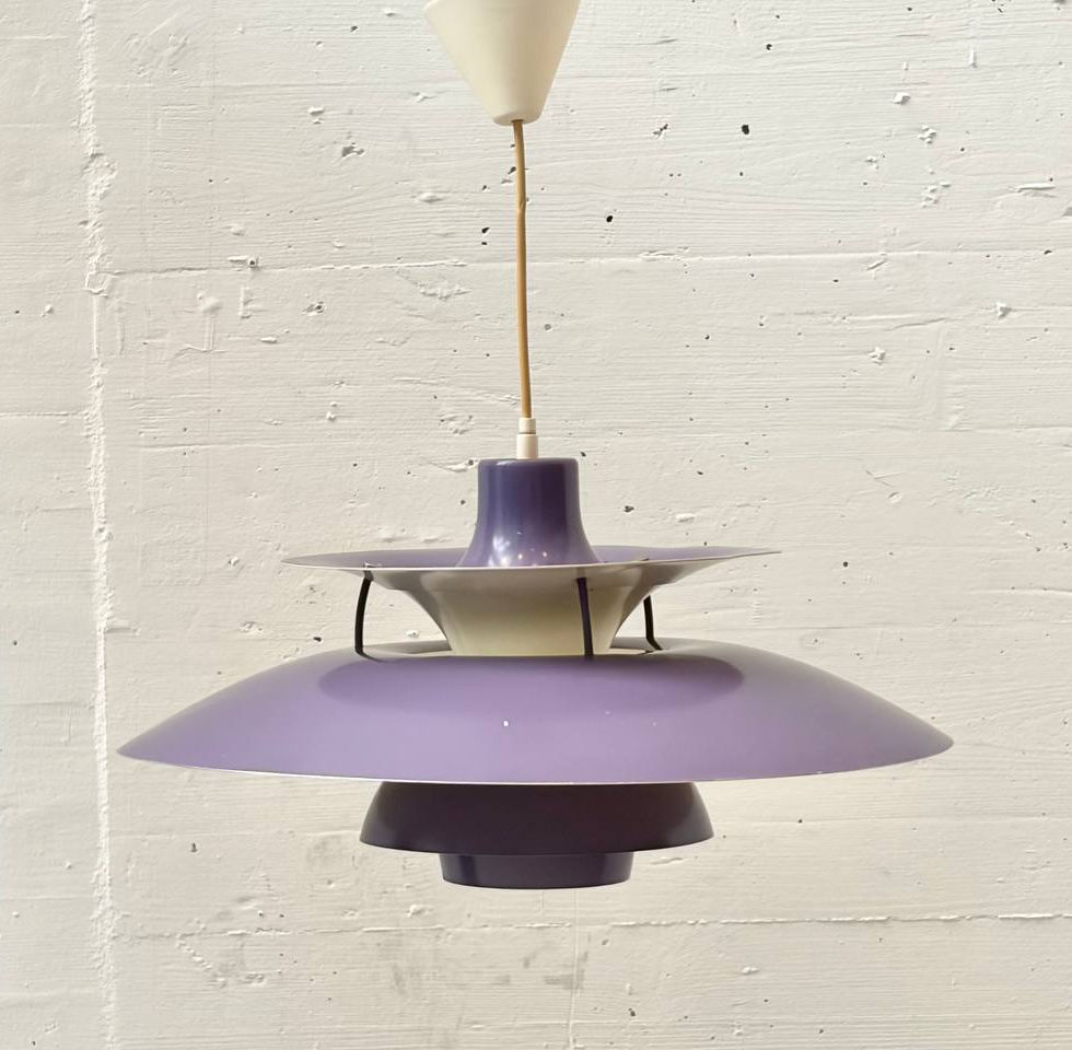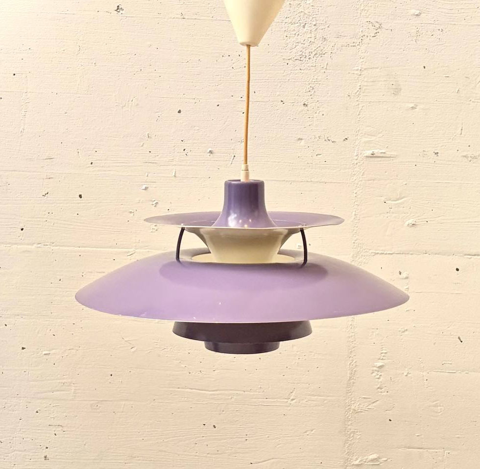 Die vorliegende Ausführung besticht durch ihre seltenere Farbgebung in Violett, kombiniert mit cremefarbenen Schirmelementen sowie dem charakteristischen roten und blauen Innenaufbau. Diese farbigen Akzente sind kein dekoratives Detail, sondern Teil des ursprünglichen Lichtkonzepts: Sie neutralisieren das Licht und verbessern die Farbwiedergabe, wodurch eine besonders angenehme Lichtstimmung entsteht. Formal zeigt sich die PH 5 als perfekt ausbalanciertes Zusammenspiel konzentrischer Schirme, die sich nach unten hin staffeln und das Licht gezielt lenken. Die filigranen Streben verleihen der Konstruktion eine technische Leichtigkeit, während die grosszügige Dimension von 50 cm Durchmesser eine starke Präsenz im Raum erzeugt.
