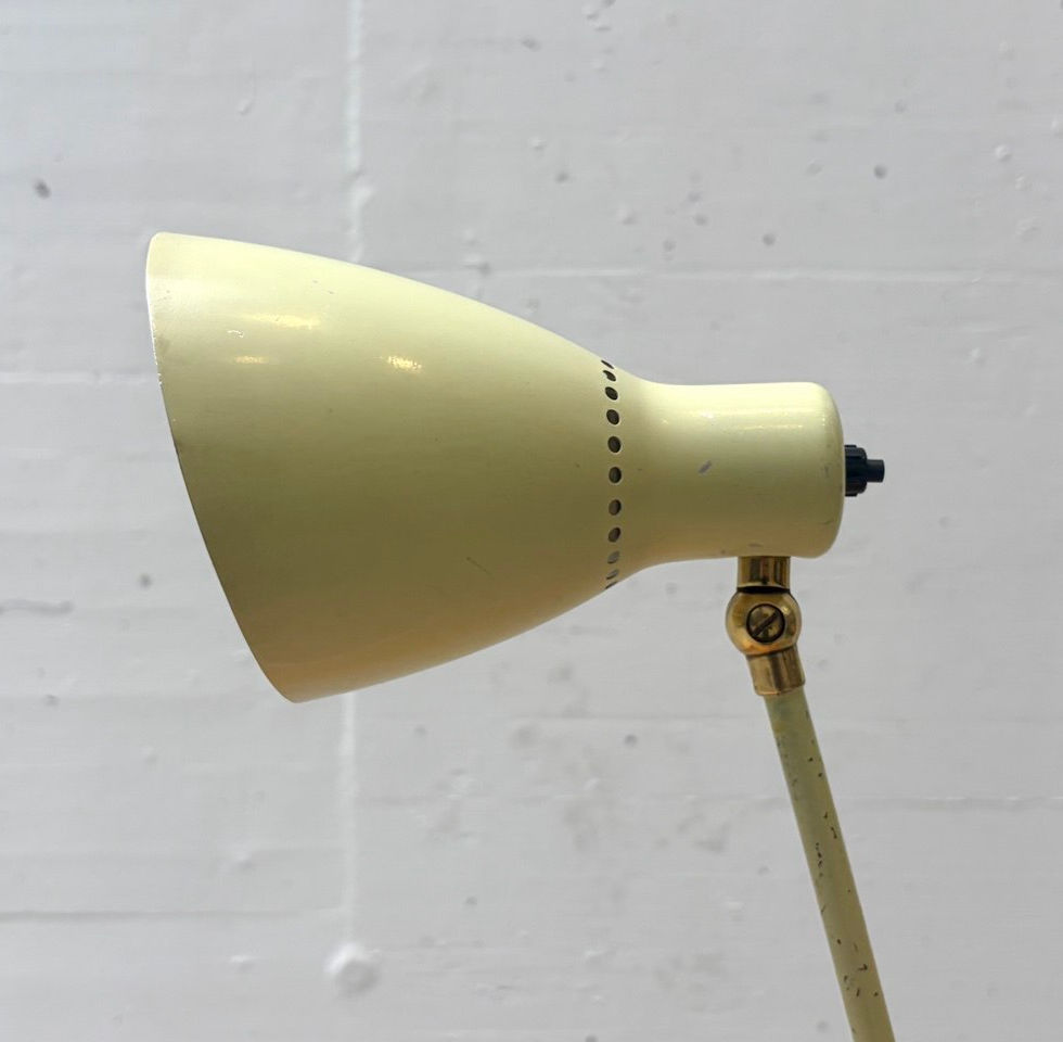 Charakteristische Tischleuchte des französischen Designers Robert Caillat aus den 1950er Jahren. Das schlank gehaltene Metallgestell geht in einen sanft geschwungenen, konischen Lampenschirm über, der in einem hellgelben Ton lackiert ist. Eine umlaufende Lochreihe im oberen Bereich des Schirms sorgt für dezente Lichtakzente und verweist auf den funktional-eleganten Gestaltungsansatz der Nachkriegsmoderne. Der Schirm ist über ein Messinggelenk verstellbar und erlaubt eine gezielte Ausrichtung des Lichts, ideal als Schreib- oder Beistellleuchte. Ein integrierter Druckknopfschalter am Leuchtenkopf rundet das durchdachte, reduzierte Design ab. Die Leuchte steht exemplarisch für die französische Industriegestaltung der 1950er Jahre, die technische Funktionalität mit klarer, zeitloser Formensprache verbindet.