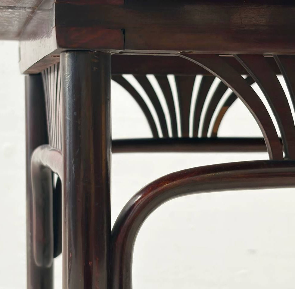 Eleganter Konsolentisch / Aufwartetisch von Thonet, Wien, datiert in die 1910er Jahre und dem Modell 221 / 9174 zuzuordnen, ein feines Beispiel des Wiener Jugendstils und der klassischen Bugholztechnik. Der Tisch ist aus massivem Buchenholz gefertigt, wobei die Beine und Zargen aus gebogenem Bugholz mit einem Durchmesser von ca. 25 mm ausgeführt sind, ergänzt durch stabilisierende Versteifungsbügel mit ca. 18 mm Stärke, und vollständig mahagonifarben gebeizt, was dem Möbel eine warme, tiefe und elegante Farbwirkung verleiht. Die charakteristischen, stilisierten Palmetten- beziehungsweise Fächerformen aus Sperrholz sind sowohl in der Tischblattzarge als auch im oberen Versteifungsbügel eingelassen und prägen die filigrane Erscheinung dieses Modells. Die Tischplatte besteht aus massivem Holz mit ca. 16 mm Stärke, zeigt eine umlaufend bombierte Kante und ist ebenfalls mahagonifarben gebeizt, wodurch sich ein harmonisches Gesamtbild mit dem Untergestell ergibt. Die Konstruktion folgt den typischen Gestaltungs- und Fertigungsprinzipien der Thonet’schen Serienproduktion jener Zeit und vereint hohe Stabilität mit einer leichten, beinahe schwebenden Optik. Unterseitig befindet sich die originale Papieretikette THONET WIEN sowie eine Einschlagnummer (11), wie sie für das zweite Thonet-Label verwendet wurde, das nachweislich zwischen 1886 und 1921 im Einsatz war, wodurch eine Datierung um circa 1910 gut belegt ist.
