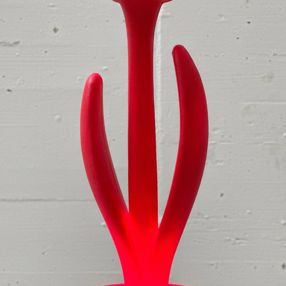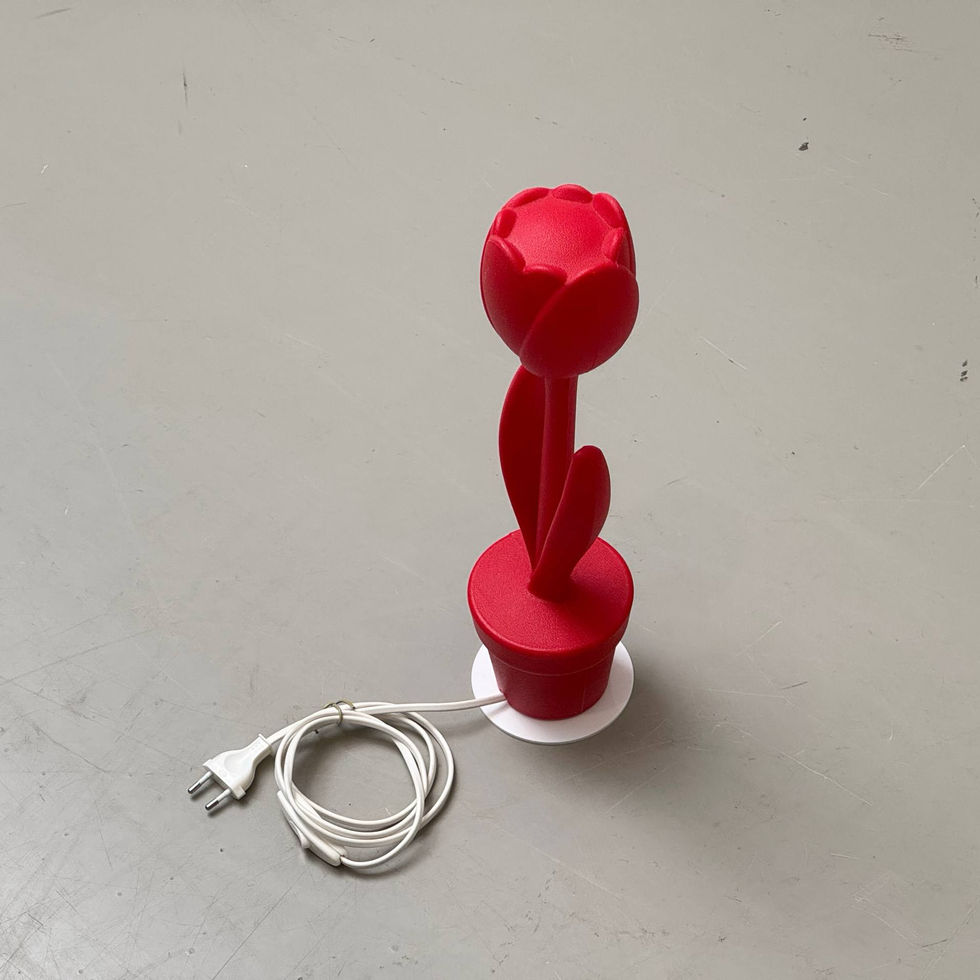 Die organische Formensprache zitiert die abstrahierte Tulpe: geschlossene Blütenform mit weich modellierten Blütenblättern, schlanker Stiel und angedeutete Blattstruktur. Der transluzente, rot durchgefärbte Kunststoff erzeugt im eingeschalteten Zustand eine intensive, nahezu leuchtende Lichtwirkung mit homogener Ausstrahlung. Besonders reizvoll ist die Materialität – typisch für Myyour – mit leicht satinierter Oberfläche und klarer Konturführung. Im Unterschied zur serienmässigen Grossversion wirkt dieser Prototyp fast wie ein Designobjekt zwischen Lichtskulptur und Pop-Art-Figur. Durch die geringe Stückzahl und die Tatsache, dass diese Version nie offiziell im Markt war, besitzt sie klaren Sammlercharakter. Ein aussergewöhnliches Stück für Designsammler, Konzeptwohnungen oder kuratierte Interieurs mit Fokus auf frühes 2000er-Design und Kunststoffästhetik.
