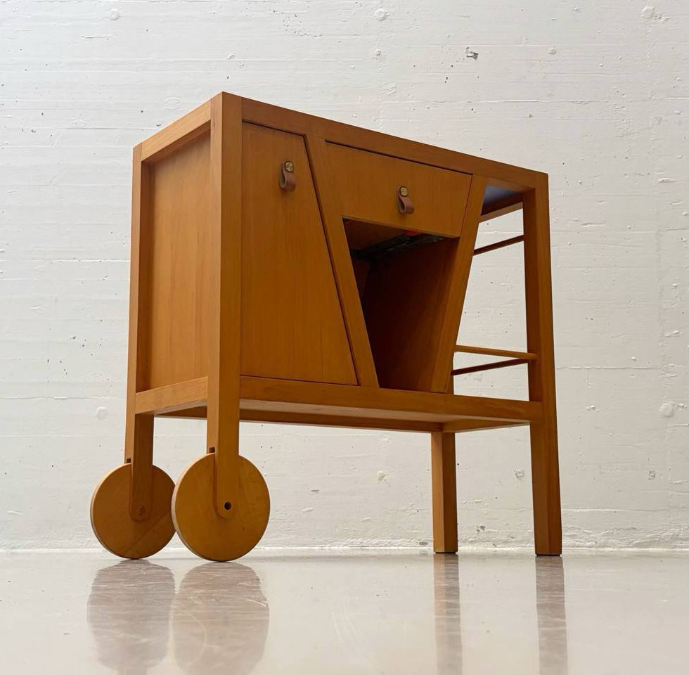 Eleganter Vintage-Servierwagen aus hellem Massivholz mit klarer, funktionaler Formensprache. Der Korpus ruht auf vier schlanken Beinen, wobei zwei hintere Räder ein leichtes Verschieben ermöglichen. Charakteristisch ist die integrierte, seitlich ausziehbare Schiebeplatte, die die Ablagefläche flexibel erweitert und in einer kontrastierenden Farbgestaltung ausgeführt ist. Unterhalb der Deckfläche befinden sich zwei geneigte Klappenfächer mit Lederzuglaschen, die praktischen Stauraum für Flaschen, Geschirr oder Barutensilien bieten. Die offene Seitenstruktur und die ausgewogenen Proportionen verleihen dem Möbel eine leichte, architektonische Wirkung – ideal als Barwagen, Serviermöbel oder mobiles Sideboard im Wohn- oder Essbereich.