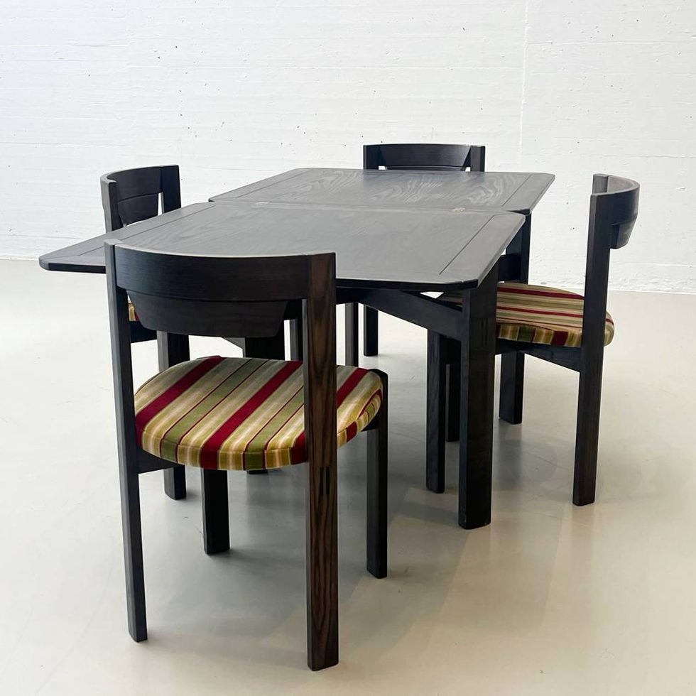 Der dazugehörige Tisch ist ebenfalls aus dunkel gebeiztem Holz gearbeitet und besitzt eine praktische Klappmechanik. Durch die aufklappbaren Tischplatten lässt sich die Nutzfläche rasch vergrössern, wodurch das Möbel vom kompakten Alltags- zum Familientisch wird. Die Konstruktion ist solide ausgeführt, die Untergestelllösung schlicht und funktional.