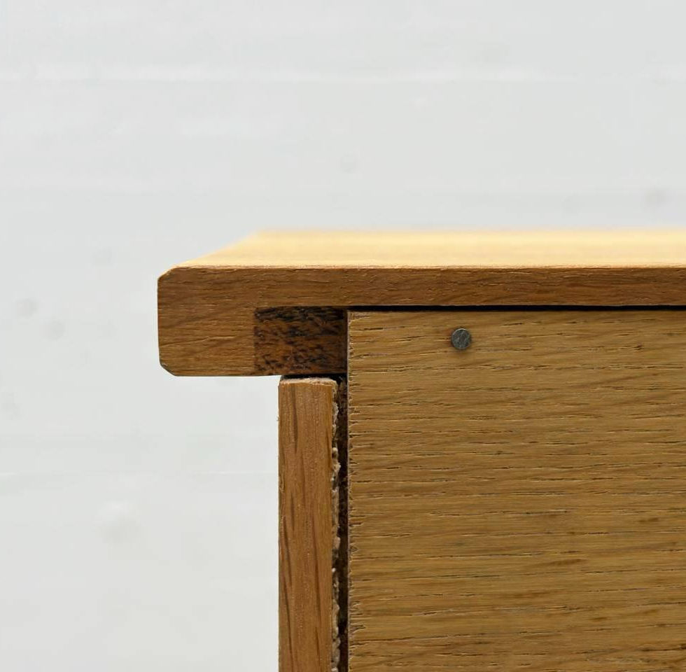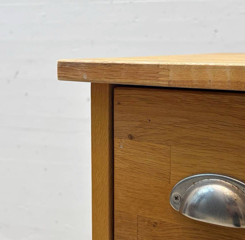 Funktionales Sideboard aus massiver Eiche, ausgeführt in klarer, sachlicher Formensprache der 1970er Jahre. Die Front zeigt eine harmonische Rasterung mit unterschiedlich grossen Schubladen, versehen mit markanten, halbrunden Muschelgriffen aus Metall. Die sichtbare Keilzinken- und Massivholzstruktur an Kanten und Schubladen unterstreicht die hochwertige Verarbeitung. Der schlichte Sockel und die ruhige Holzmaserung verleihen dem Moebel eine zeitlose, solide Anmutung, ideal als Stauraummoebel im Wohn- oder Arbeitsbereich.