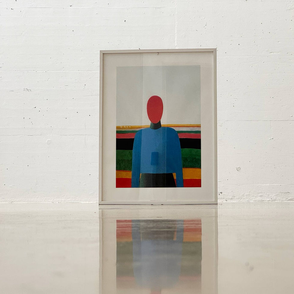 Farbstarker Kunstdruck nach dem Werk Torso des russischen Avantgarde-Künstlers Kazimir Malevich, entstanden ursprünglich zwischen 1928 und 1932. Die Komposition zeigt eine reduzierte, beinahe ikonische Figurenform mit rotem Kopf und blauem Körper vor einer rhythmisch gegliederten, geometrischen Landschaft in kräftigen Farbflächen. Typisch für Malevichs späte Arbeiten verbindet dieses Motiv figurative Elemente mit der klaren, abstrahierten Formsprache des Suprematismus. Die starke Farbkontrastierung und die ruhige, fast meditative Bildwirkung machen dieses Werk zu einem markanten Blickfang zwischen Kunst und Design.