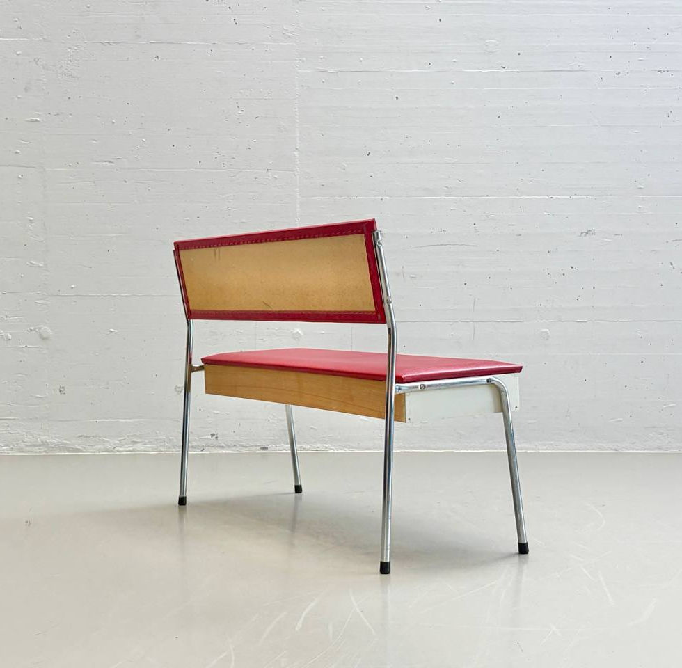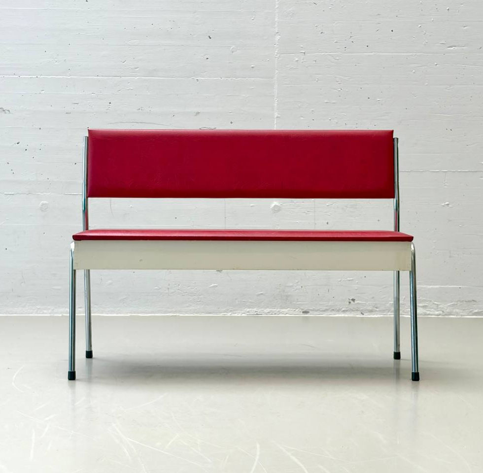 Bei dem gezeigten Möbelstück handelt es sich um eine kompakte Sitzbank mit integriertem Stauraum, deren Design stark vom funktionalen Industriedesign der 1970er Jahre beeinflusst ist. Die Bank besteht aus einem schlichten Korpus in Weiss, kombiniert mit einem verchromten Stahlrohrgestell und rotem Kunstlederpolstern auf Sitzfläche und Rückenlehne. Ein besonderes Merkmal dieser Bank ist die aufklappbare Sitzfläche, die Zugang zu einem grosszügigen Staufach im Inneren des Korpus gewährt. Die Klappmechanik mit Metallbändern ist einfach, aber funktional gehalten, während die Deckelinnenseite roh verarbeitet ist – ein weiterer Hinweis auf den rein funktionalen Charakter des Möbels. Die Verarbeitung des verchromten Gestells mit Kunststoffgleitern unterstreicht den praxisorientierten Entwurf, wie er typisch für Institutionalmöbel oder modulare Systemmöbel der späten Moderne war.
