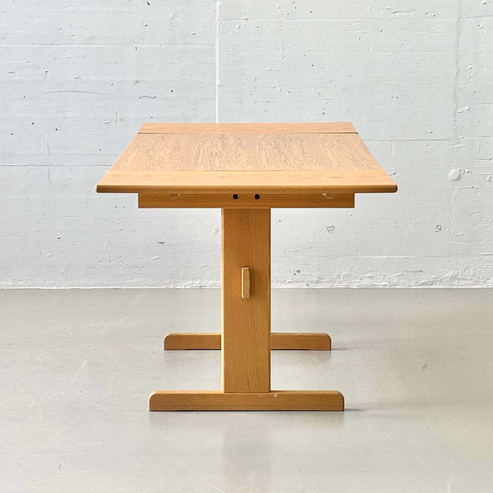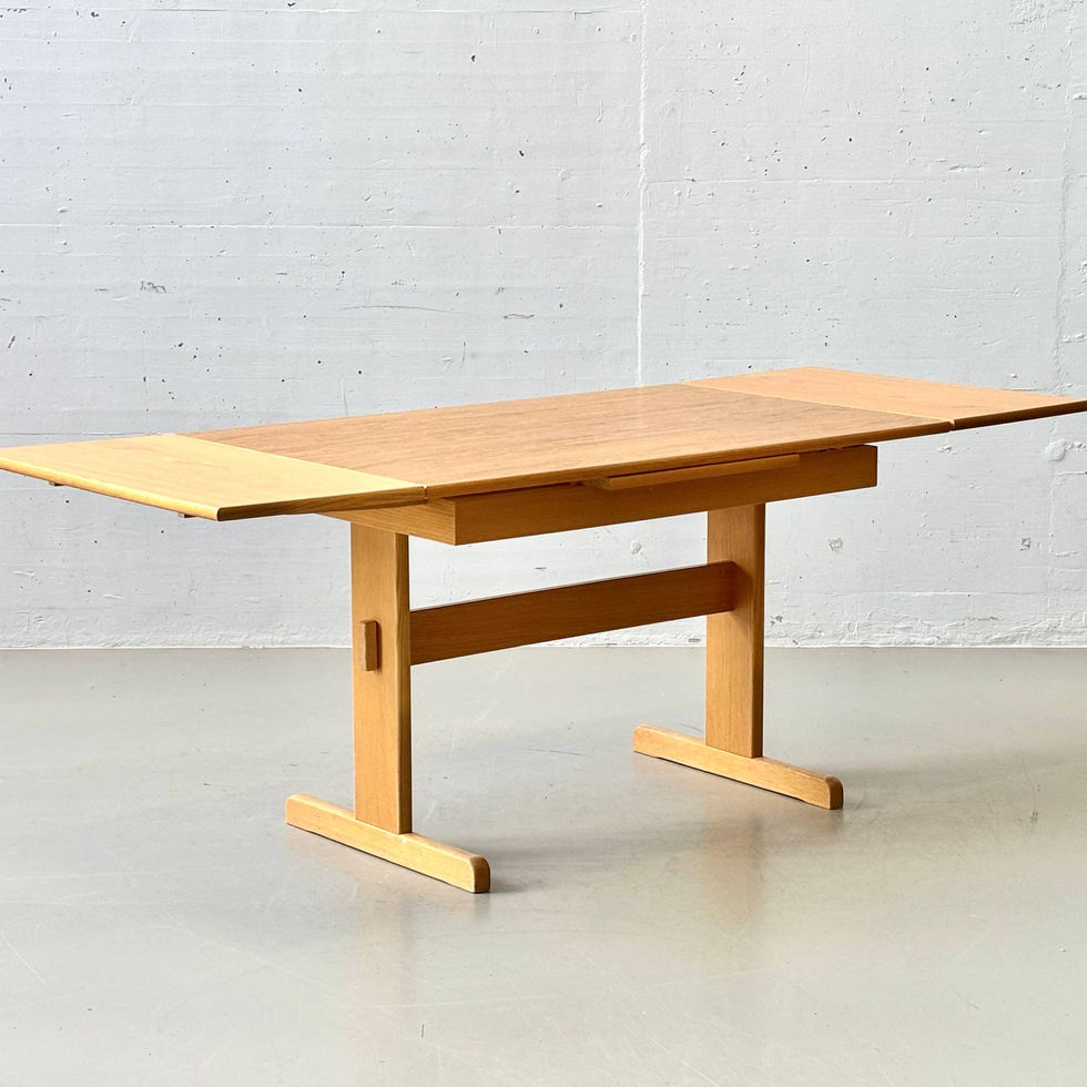 Zeitloser Esstisch in klarer, funktionaler Formensprache der 1970er Jahre, gefertigt aus massivem Holz und Eichenfurnier. Die warme, honigfarbene Oberfläche unterstreicht die natürliche Maserung und verleiht dem Tisch eine ruhige, wohnliche Ausstrahlung – typisch für skandinavisches Design dieser Zeit. Die Konstruktion überzeugt durch ihre durchdachte Einfachheit: Ein stabiles Untergestell mit seitlichen Wangenelementen und verbindender Traverse sorgt für hohe Standfestigkeit, während die fein gearbeitete Tischplatte mit sanft gerundeten Kanten elegant darüber schwebt. Besonders praktisch sind die beidseitig ausziehbaren Enden, die sich nahtlos integrieren und den Tisch von 125 cm auf grosszügige 205 cm verlängern. Dadurch eignet er sich sowohl für den täglichen Gebrauch als kompakter Esstisch als auch für gesellige Runden mit mehreren Personen. Die Erweiterungsplatten fügen sich harmonisch ins Gesamtbild ein und bewahren die klare Linienführung.