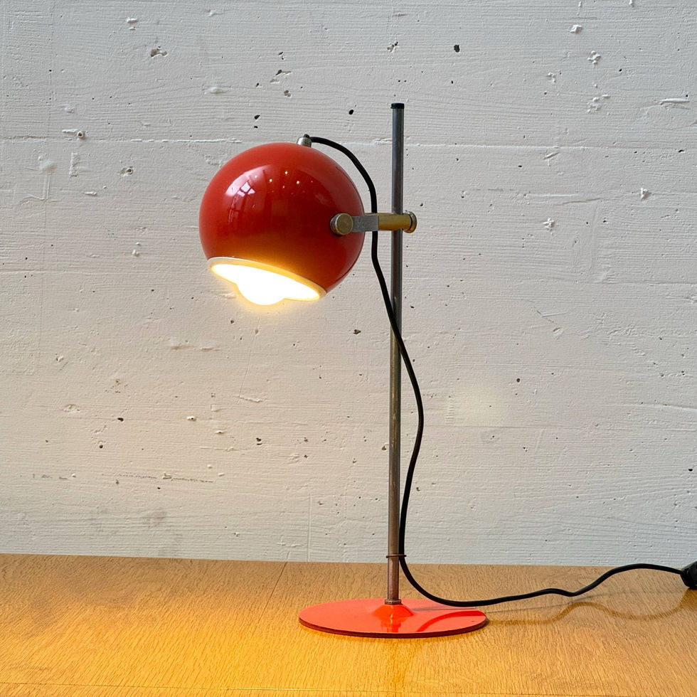 Charakteristische Tischleuchte im ausgeprägten Space-Age-Design der 1970er Jahre. Der kugelförmige, orangerote lackierte Metallschirm ist als klassischer Eyeball ausgeführt und über eine umlaufende Metallschelle am vertikalen Stab befestigt. Der Schirm ist dreh- und kippbar, wodurch sich der Lichtaustritt flexibel ausrichten lässt. Die Innenfläche ist hell ausgeführt und sorgt für eine direkte, gerichtete Lichtwirkung. Der schlanke, zylindrische Metallstab sitzt auf einem flachen, runden Fuss in passender orangeroter Lackierung. Sichtbare Messingelemente an der Aufnahme setzen einen materialtypischen Akzent der Zeit. Der Ein- und Ausschalter ist als klassischer Schnurschalter ausgeführt.