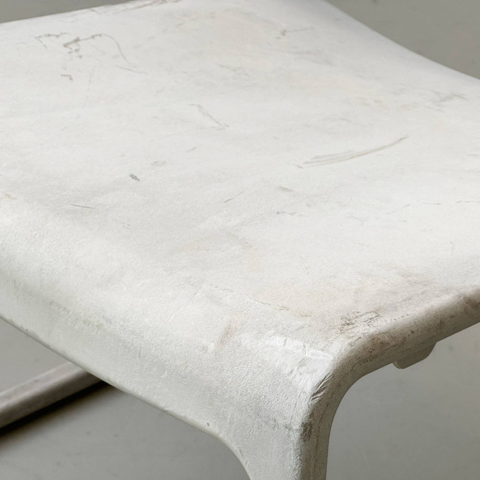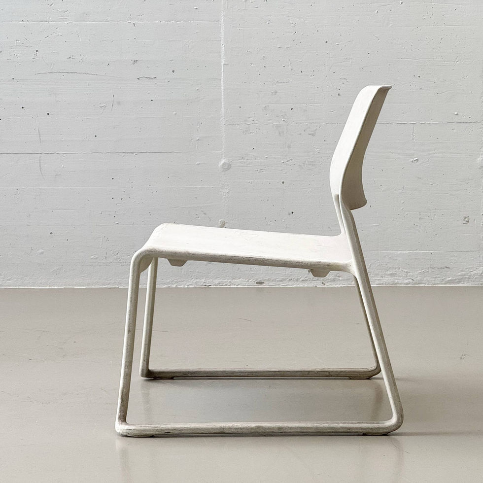 Markante Stapelstühle aus der Spark Series, entworfen von Don Chadwick für Knoll. Das Design entstand auf Initiative des damaligen Design Directors Benjamin Pardo mit dem Ziel, einen leichten, stapelbaren und zugleich robusten Stuhl für den Objektbereich zu entwickeln. Die Sitzschale ist aus glasfaserverstärktem Polypropylen (PP GF20) gefertigt – einem technisch hochwertigen Verbundmaterial, das sich durch besondere Stabilität, Langlebigkeit und Witterungsbeständigkeit auszeichnet. Die leicht strukturierte, matte Oberfläche verleiht den Stühlen eine industrielle, beinahe mineralische Anmutung und unterscheidet sie deutlich von gewöhnlichem Kunststoff. Die weich gerundete Formgebung mit integrierter Grifföffnung in der Rückenlehne sorgt für hohen Komfort und praktische Handhabung. Das charakteristische Kufengestell ist integraler Bestandteil der Konstruktion und ermöglicht ein platzsparendes Stapeln.