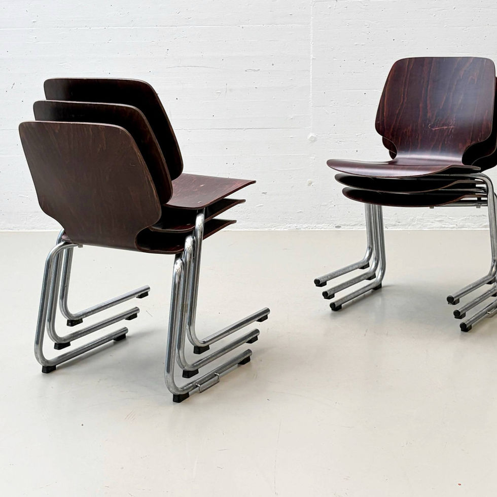 Diese stapelbaren Freischwingerstühle stammen aus den 1970er Jahren und zeigen einen klaren Einfluss des funktionalen Industriedesigns jener Zeit. Die Ausführung erinnert an Modelle von Galvanitas oder Pagholz Flötotto, wie sie für Schulen, Universitäten oder Versammlungsräume gefertigt wurden. Charakteristisch ist die ergonomisch geformte Sitzschale aus formverleimtem Schichtholz mit einer dunklen, fast mahagonifarbenen Beizung.