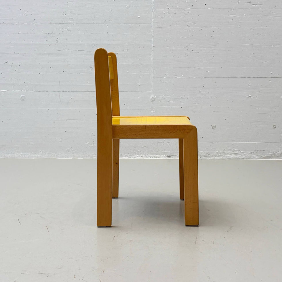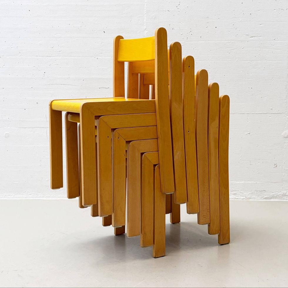 Die hier gezeigten Stühle bestehen aus massivem Buchenholz mit einer farbig lackierten Sitzfläche und Rückenlehne in kräftigem Gelb. Das markante, geradlinige Gestell mit seinen abgerundeten Kanten und sauber gearbeiteten Eckverbindungen verleiht den Stühlen eine solide und zugleich moderne Erscheinung. Dank ihrer stapelbaren Konstruktion lassen sie sich platzsparend lagern und eignen sich ideal für den Einsatz in Mehrzweckräumen, Ateliers oder öffentlichen Einrichtungen.
