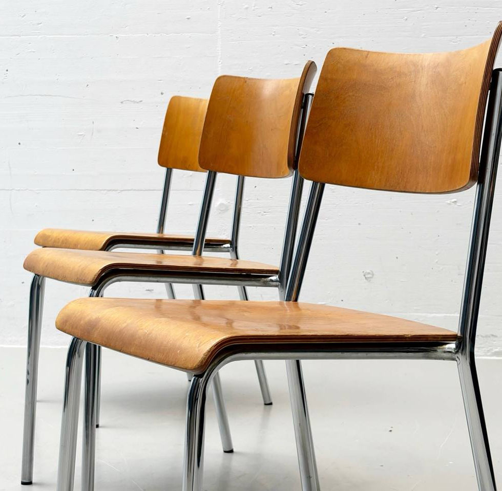 Die Stühle befinden sich in gutem, originalem Zustand mit schöner, gleichmässiger Patina. Die Holzflächen zeigen leichte Kratzer, kleine Kantenabnutzungen und Gebrauchsspuren, die den authentischen Charakter unterstreichen. Das verchromte Gestell weist minimale matte Stellen und punktuelle Gebrauchsspuren auf, ist jedoch stabil und glänzend. Insgesamt sind es gepflegte, ehrliche Stühle mit typischem Vintage-Charme.