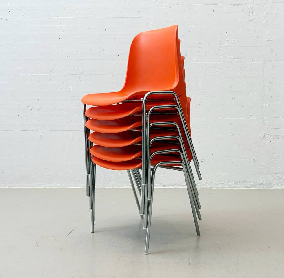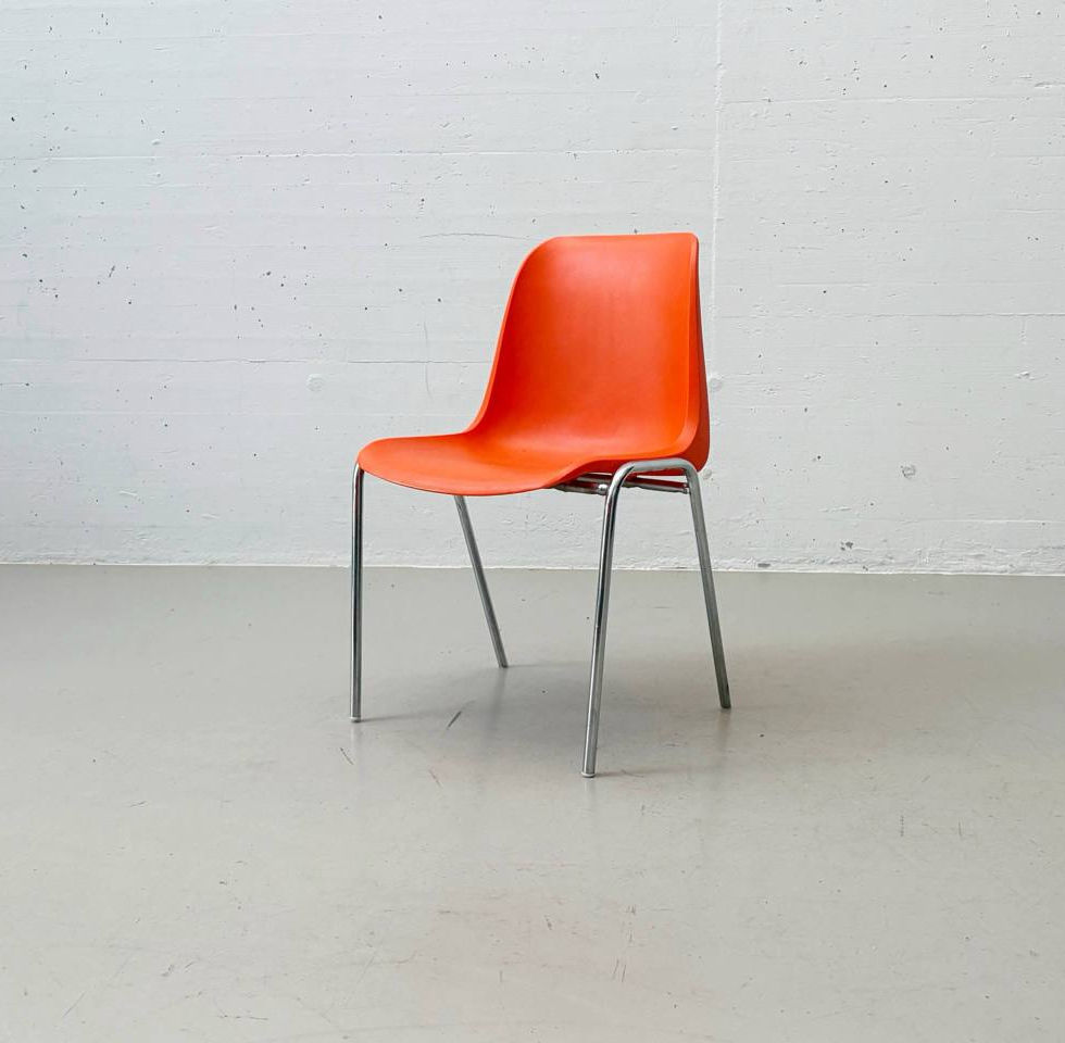 Dieser klassische Stapelstuhl Modell Europa stammt aus deutscher Serienfertigung der 1970er Jahre und überzeugt mit einer robusten, orangefarbenen Kunststoffsitzschale und einem verchromten Rundrohrgestell. Die ergonomisch geformte Sitzschale, die stapelbare Konstruktion sowie die typischen seitlichen Verbindungsbügel machen ihn zu einem vielseitigen, funktionalen Allrounder.