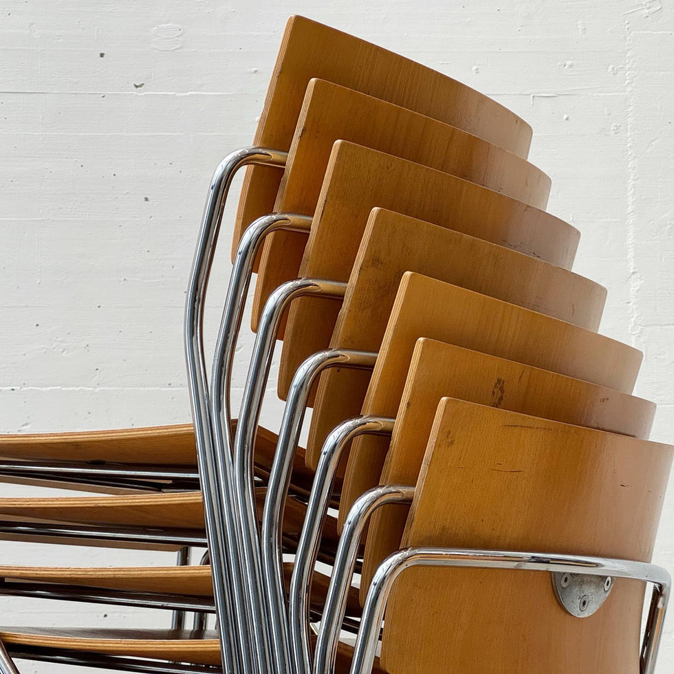 Objektstuhl des dänischen Herstellers Labofa, vertrieben in der Schweiz durch Zingg Lamprecht. Reduzierte, funktionale Gestaltung mit verchromtem Stahlrohrgestell und formverleimter Sitz- sowie Rückenfläche in warmem Buchenfurnier. Die markante seitliche Verstrebung verleiht dem Stuhl eine charakteristische Silhouette und sorgt zugleich für hohe Stabilität. Dank der klaren Linienführung und der stapelbaren Konstruktion eignet sich das Modell ideal für Essbereich, Atelier, Office oder Projektumgebungen. Klassischer skandinavischer Objektstuhl mit zeittypischer 70er Jahre Anmutung. Zustand: Schöner Vintage Zustand mit leichten altersbedingten Gebrauchsspuren am Holz sowie minimalen Spuren am Chrom. Manche Stühle haben teilweise kleine Absplitterungen. Diese sind vollkommen Stabil und voll funktionstüchtig.