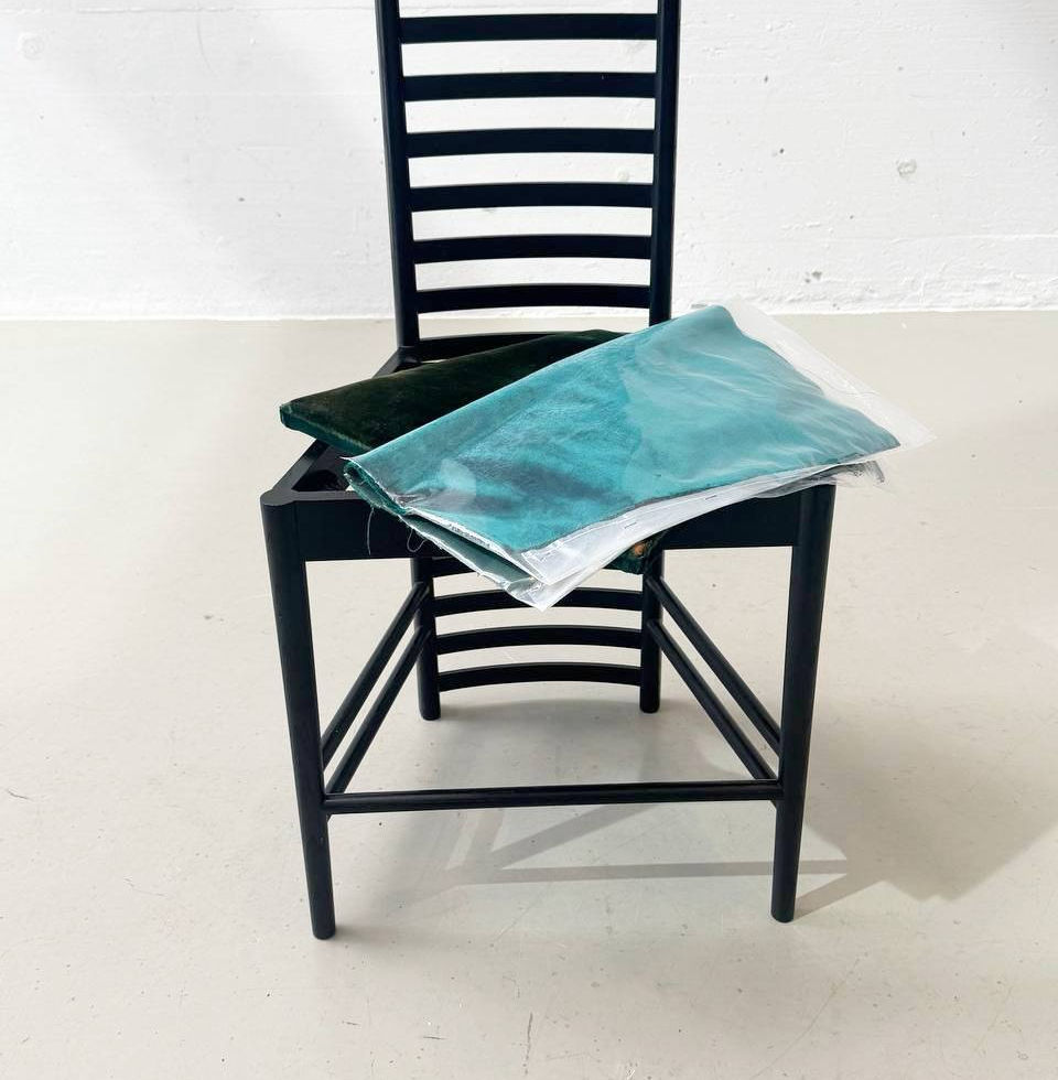 Zum Stuhl gehört ein original verpackter Ersatzstoff, ebenfalls bei Cassina erworben, der für einen neuen Bezug vorgesehen ist. Auf der Unterseite befindet sich die Herstellerprägung mit Cassina-Logo, Mackintosh-Signatur und Seriennummer, dazu die originale Produktkarte mit Modellbezeichnung, Entwurfsjahr, Materialangabe und Referenzen zu bedeutenden Ausstellungen und Publikationen.