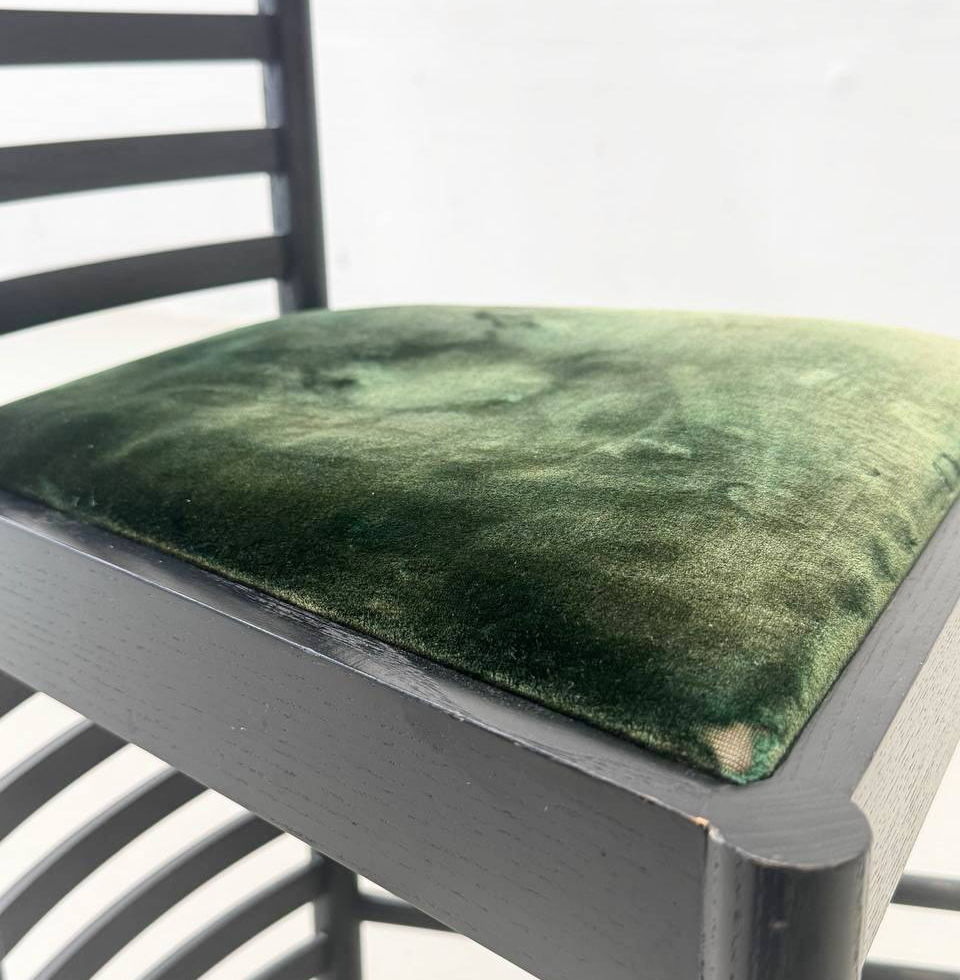 Der Korpus besteht aus schwarz gebeizter Esche, was die schlanke Konstruktion optisch betont, während die waagerechten Sprossen der Rückenlehne und Zargen ein harmonisches Raster erzeugen. Die Sitzfläche ist gepolstert und mit einem grün schimmernden Spezialvelours bezogen, der durch seine edle Textur einen weichen Kontrast zur strengen Linienführung des Holzgestells bildet.