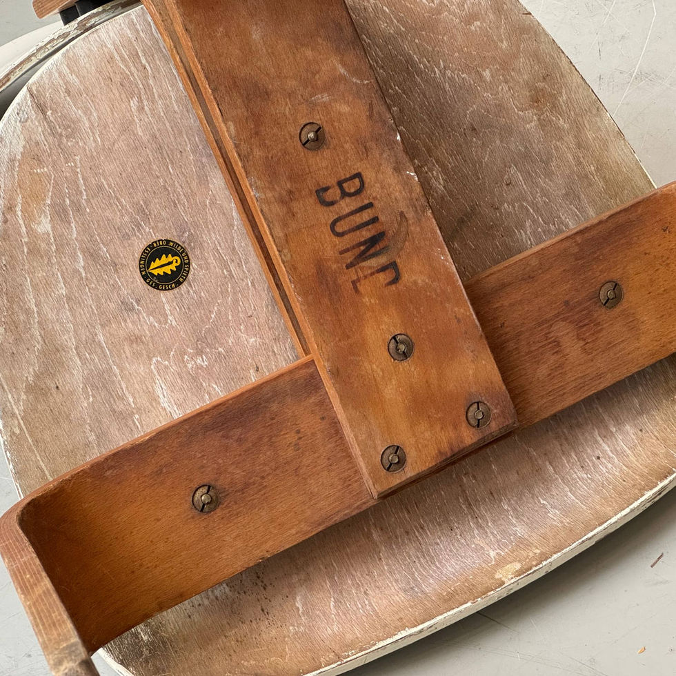 Klassischer Schichtholzstuhl nach einem Entwurf von Egon Eiermann, gefertigt von Wilde + Spieth, Esslingen. Die organisch geformte Sitz- und Rückenschale aus formverleimtem Holz zeigt die für Eiermann typische, funktional reduzierte Linienführung. Die Konstruktion folgt dem Prinzip der sichtbaren Verschraubung und klaren Statik – ehrlich, leicht und materialgerecht. Das Gestell besteht aus gebogenem Schichtholz mit warmem, mittelbraunem Ton. Sitz und Lehne sind weiss lackiert, wodurch ein spannender Kontrast zwischen konstruktiver Struktur und farblicher Fläche entsteht. Die Unterseite ist mit Brandstempel „BUND“ versehen, zusätzlich befindet sich das originale Wilde + Spieth Label auf der Sitzunterseite – ein klarer Hinweis auf die authentische Produktion. Ein funktional durchdachtes, zeitloses Designobjekt mit architektonischem Charakter – sowohl als Solitaer wie auch als Set einsetzbar.