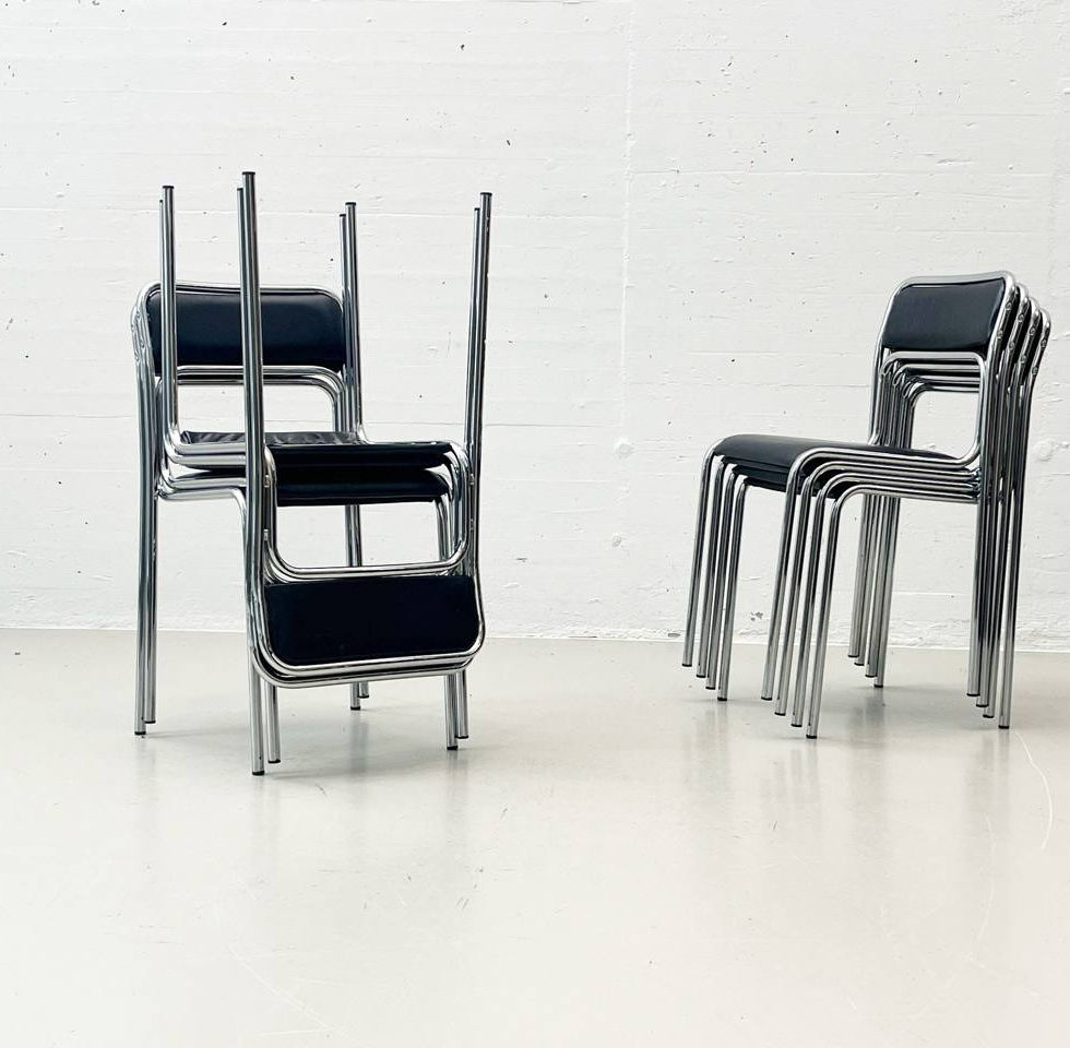 Die Stühle lassen sich hoch stapeln, sind dadurch ideal für Essbereich, Konferenz oder Gastronomie, und wirken durch die Kombination aus Chrom und Schwarz angenehm sachlich – zwischen Bauhaus-Zitaten und 80er-Minimalismus.