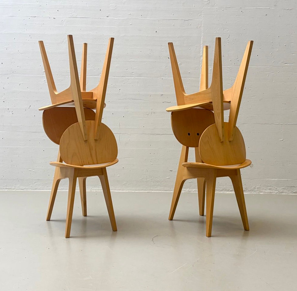 Diese 3221 Chairs wurden von Junzo Sakakura entworfen und von Tendo Mokko gefertigt. Der Entwurf geht auf die 1950er Jahre zurück und wurde in den 1980er Jahren erneut produziert. Die Stühle zeigen eine klare, modernistische Formensprache mit deutlich japanischem Charakter: reduziert, ausgewogen und zugleich organisch. Das vierbeinige Gestell trägt eine leicht geschwungene Sitzfläche sowie eine sanft gerundete Rückenlehne, die sich ergonomisch an den Körper anschmiegt. Die Konstruktion wirkt skulptural und leicht, bleibt dabei jedoch stabil und präzise ausgeführt. Gefertigt aus massivem Buchenholz, verbinden die Stühle westliche Moderne mit japanischer Handwerkskultur und spiegeln Sakakuras enge Zusammenarbeit mit Le Corbusier ebenso wider wie seine eigene architektonische Handschrift.