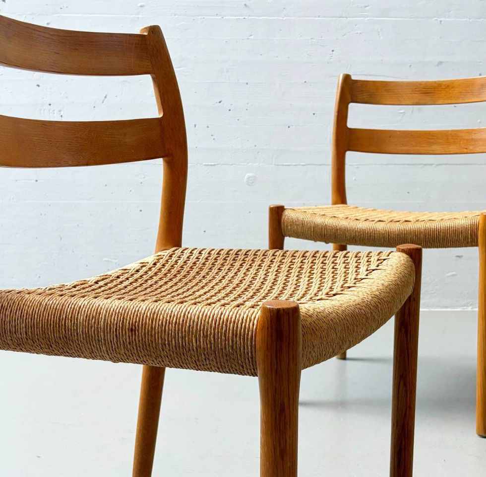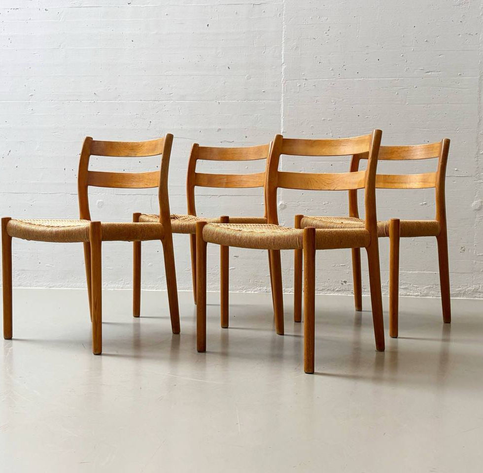 Elegantes Set aus vier Stühlen des dänischen Designers Niels O. Møller, ausgeführt von J.L. Møllers in den 1960er Jahren. Die Stühle zeigen die typisch klare skandinavische Formensprache mit leicht gerundeten Linien, organischem Massivholzgestell in Teak und handgeflochtenem Sitz aus Papierkordel. Die harmonische Kombination aus warmem Holzton und naturbelassenem Geflecht verleiht den Stühlen einen zeitlosen, hochwertigen Ausdruck – ein Klassiker des Danish Modern Designs.