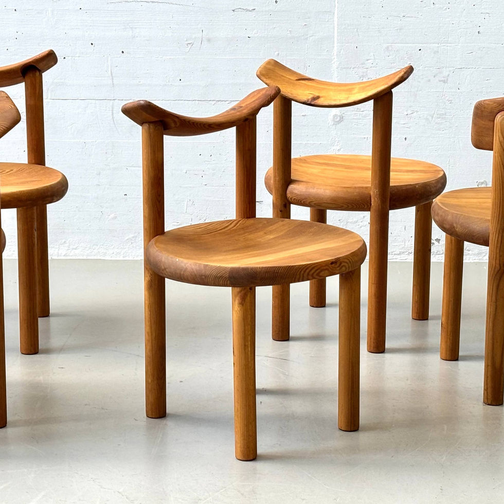 Diese charakteristischen Stühle wurden in den 1970er Jahren vom dänischen Designer Rainer Daumiller entworfen und stehen exemplarisch für die organische, naturverbundene Formensprache des skandinavischen Designs jener Zeit. Gefertigt aus massivem Kiefernholz überzeugen sie durch ihre warme Ausstrahlung und die bewusst sichtbare Maserung mit markanten Astbildern, die jedem Stuhl einen individuellen Charakter verleiht. Typisch für Daumillers Entwürfe ist die kraftvolle, fast archaische Gestaltung: Die runde Sitzfläche ist sanft ausgeformt und leicht vertieft, was für angenehmen Sitzkomfort sorgt. Die vier massiven, zylindrischen Beine gehen fliessend in die Konstruktion über und unterstreichen die stabile, handwerkliche Anmutung. Die Rückenlehne besteht aus einem quer gesetzten, ergonomisch geformten Holzstück, das von zwei vertikalen Streben getragen wird und eine angenehme Unterstützung im Rückenbereich bietet.