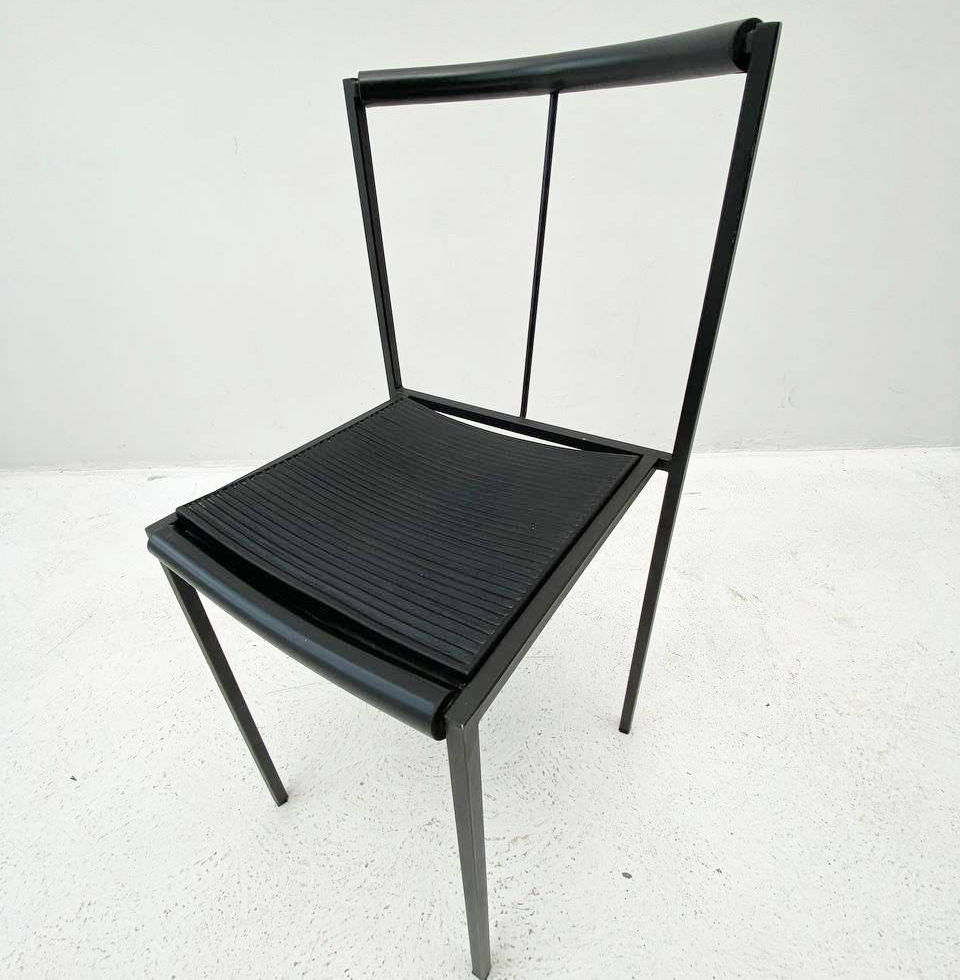 Die Stühle haben eine Struktur aus mattschwarzem Metall mit vier Beinen mit quadratischem Querschnitt, deren Rückseite sich bis zur gesamten Rückenlehne erstreckt.