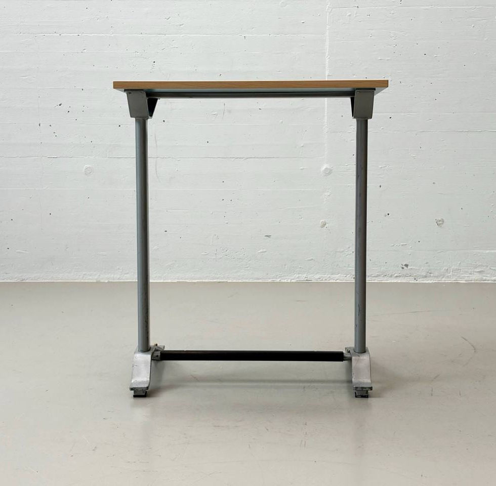 Tavolino alto e stretto risalenti agli anni '50/'60, tipici esempi del design industriale funzionale dell'epoca. Modelli di questo tipo erano ampiamente utilizzati in Svizzera in scuole tecniche, laboratori e uffici di progettazione, e ricordano le soluzioni adottate da produttori come Embru o nelle prime serie USM Haller.