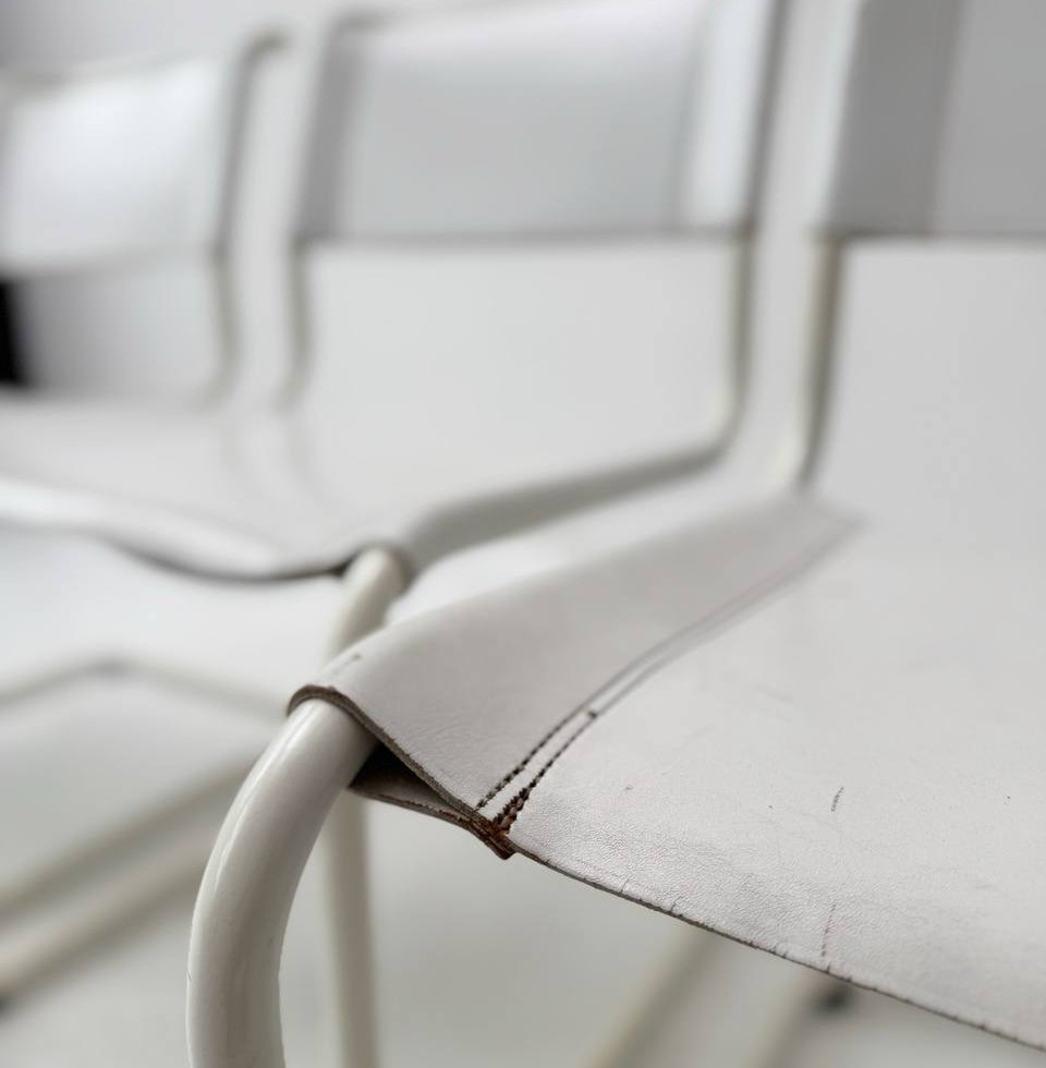 Die Stühle befinden sich in einem guten aber gebrauchten Zustand. Der weisse Metallrahmen zeigt leichte Abnutzungsspuren (z.B. Lackabplatzer und Kratzer). Die Nähte sind intakt und sind sehr gut verarbeitet. Das Leder zeigt zwar auch leichte Gebrauchsspuren, dies unterstreicht aber nur das Alter der Stühle. Insgesamt sind die Stühle für ihr Alter in einem Top Zustand.