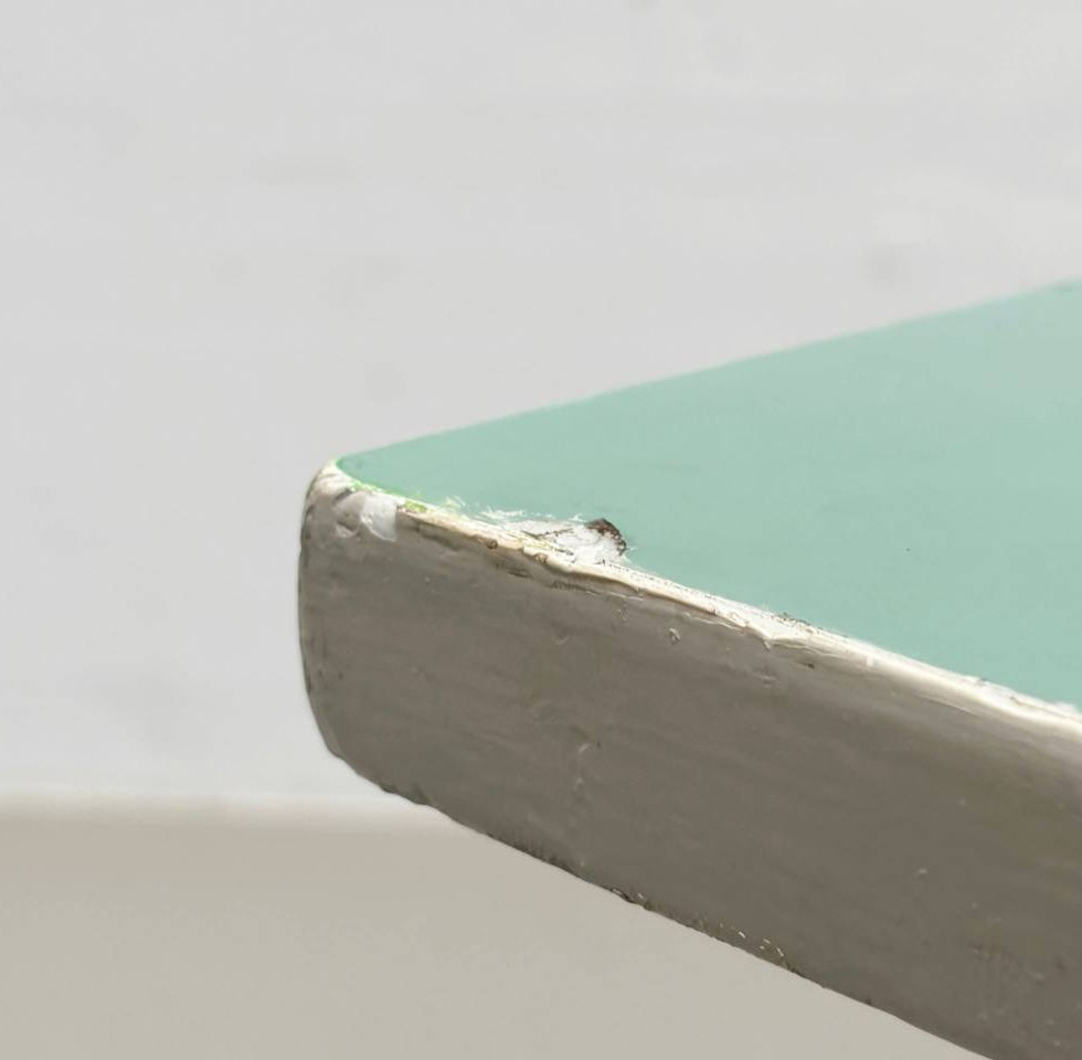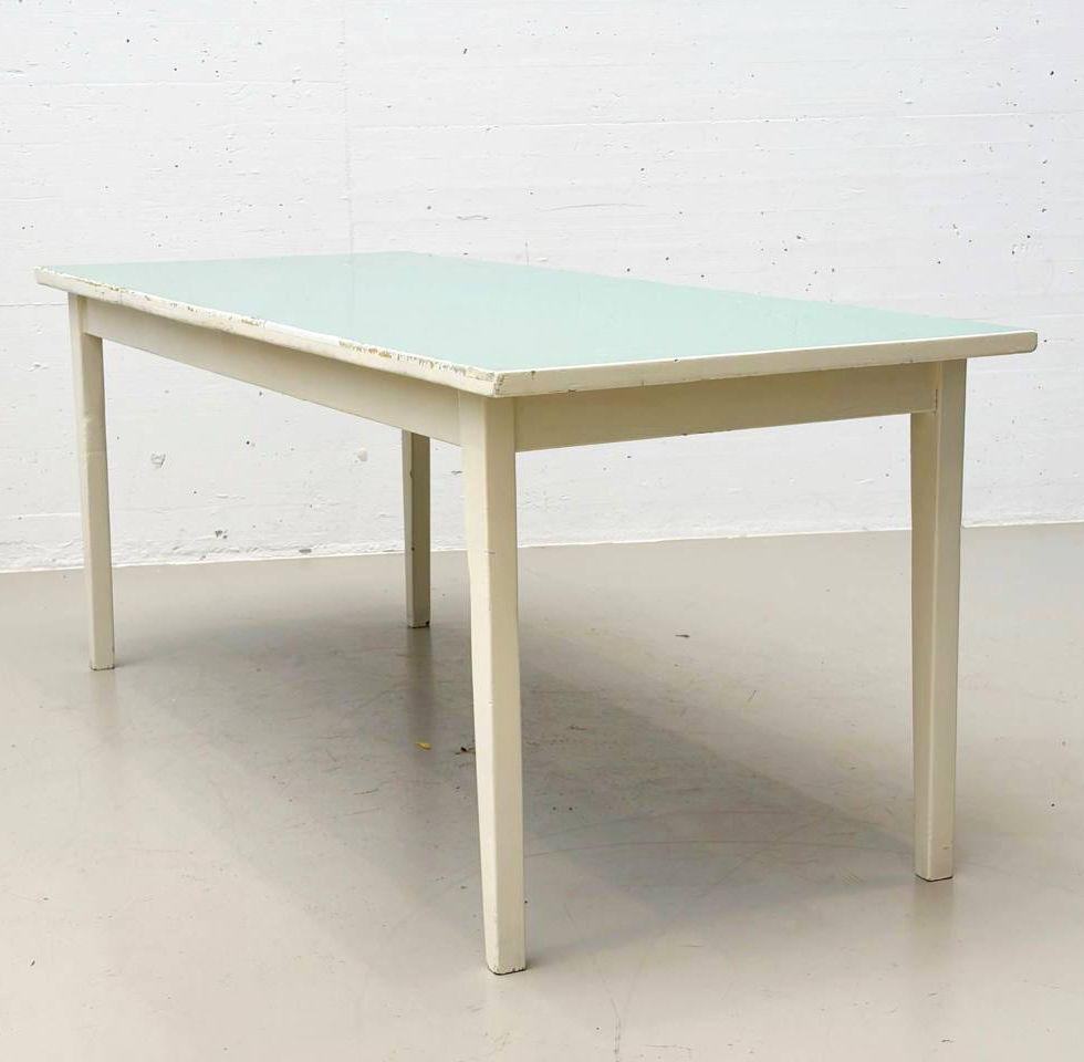 Die grüne Resopalbeschichtung war in dieser Zeit ein beliebtes Gestaltungselement, das nicht nur durch seine hygienische und pflegeleichte Oberfläche, sondern auch durch seine freundliche Farbgebung überzeugt. Solche Tische fanden sowohl in Küchen als auch in Werk- oder Aufenthaltsräumen Verwendung und zeichnen sich durch ihre solide, langlebige Bauweise aus.