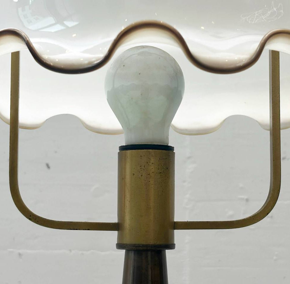 Ausdrucksstarke Tischlampe aus Italien aus den 1920er-Jahren mit einem Handgefertigten Glasschirm aus Muranoglas in charakteristischer, weich gewellter Silhouette. Der schwere Fuss aus Metall und lackiertem Holz verleiht der Lampe ein hochwertiges Erscheinungsbild, während der Glasschirm mit farbig abgesetztem Rand klassische Eleganz und dekorative Wirkung verbindet. Die Lampe erzeugt ein warmes, atmosphärisches Licht und eignet sich ideal als Akzentbeleuchtung im Wohn- oder Schlafzimmer.