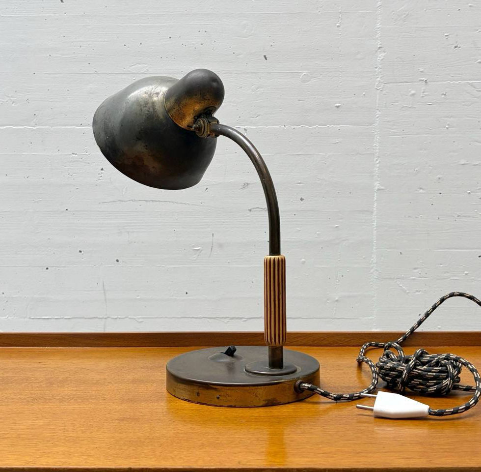 Zustand: Deutliche altersbedingte Gebrauchsspuren und Patina auf Schirm, Arm und Fuss, passend zum historischen Charakter. Voll funktionsfähig, Schalter und Elektrik wurden überarbeitet. Insgesamt ein authentisches Sammlerstück mit starkem Vintage-Charme.