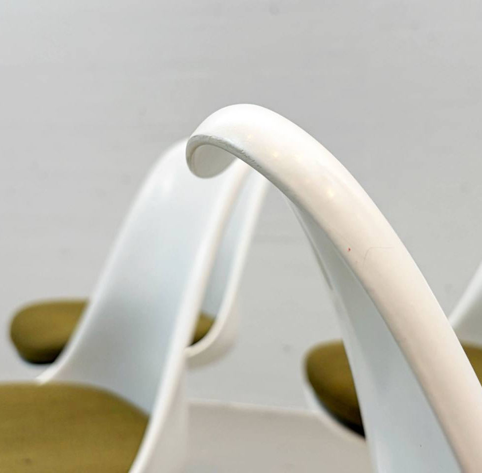 Die abnehmbaren Sitzkissen in olivgrünem Wollstoff setzen einen warmen Kontrast zur kühlen, weissen Schale und betonen den organischen Charakter des Entwurfs. Die Unterseite der Sitze trägt eine eingeprägte Knoll-Nummerierung, was die Originalität der Produktion bestätigt.