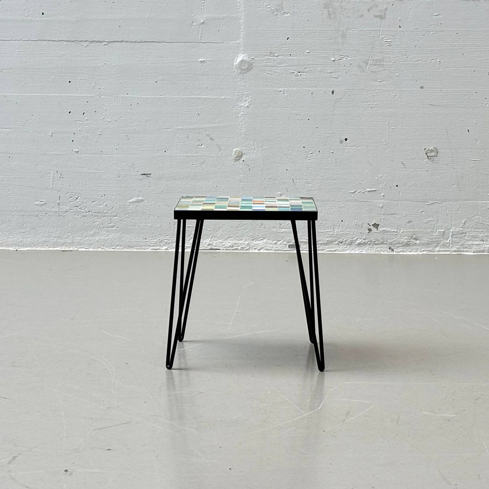 Charakteristischer kleiner Blumenhocker aus den 1960er Jahren mit quadratischer Tischplatte, ausgeführt mit einem dekorativen Keramikfliesenmosaik in harmonisch abgestimmten Farbtönen. Die Glasur zeigt eine typische Mid-Century-Palette mit Grün-, Blau-, Beige- und Akzentfarben, wie sie häufig bei europäischen Keramikarbeiten dieser Zeit verwendet wurde. Die Platte ist in einen schwarz lackierten Holzrahmen eingelassen und ruht auf einem filigranen, vierbeinigen Metallgestell aus schwarz lackiertem Rundstahl. Die leicht ausgestellten Beine sorgen für einen sicheren Stand und verleihen dem Möbel trotz seiner kompakten Masse eine elegante, luftige Anmutung. Aufgrund seiner Höhe eignet sich das Stück ideal als Blumenhocker, kleiner Beistelltisch oder dekoratives Solitärmöbel.