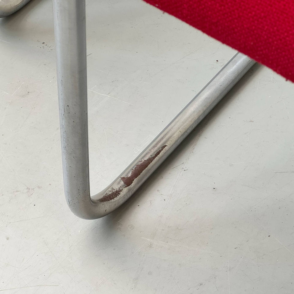 Klassisches Set aus vier Freischwingern in verchromtem Stahlrohr in der typischen Bauhaus-Formensprache der 1920/30er Jahre. Die freitragende Konstruktion sorgt für die charakteristische, leicht federnde Sitzqualität. Elegante Linienführung, reduzierte Silhouette und konstruktive Klarheit. Die Armlehnen aus originalem Bakelit sind sehr gut erhalten und zeigen eine schöne, gleichmässige Patina. Sitz- und Rückenpolster wurden neu aufgepolstert und mit rotem Textil neu bezogen – spannender Kontrast zur kühlen Stahlrohrstruktur. Das Stahlrohrgestell ist original.