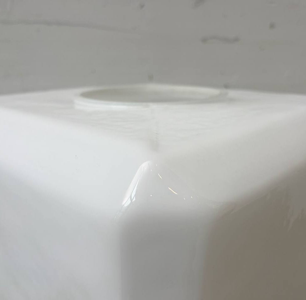 Diese Pendelleuchten vereint klare Geometrie mit einer angenehm zurückhaltenden Materialität und bringt damit eine ruhige, architektonische Präsenz in den Raum. Die würfelförmigen Schirme bestehen aus satiniertem, opalweiss gefasstem Glas und zeichnen sich durch ihre weich gerundeten Kanten sowie die leicht modellierten Flächen aus. Im eingeschalteten Zustand entsteht ein gleichmässig diffuses, blendfreies Licht, das besonders über Esstischen, Kücheninseln oder in serieller Anordnung über langen Tischen seine volle Wirkung entfaltet. Die Aufhängung ist bewusst reduziert gehalten und besteht aus patiniertem Metall mit fein gedrehten Details, die den funktionalen Charakter der Leuchten unterstreichen. Die Kombination aus dem streng kubischen Glasvolumen und der sachlichen, beinahe industriellen Aufhängung erinnert an Entwürfe der Bauhaus-Nachfolge und deren klare Formensprache. Gerade im Ensemble entsteht ein harmonisches Gesamtbild mit starkem grafischem Ausdruck und zugleich wohnlicher Lichtwirkung.