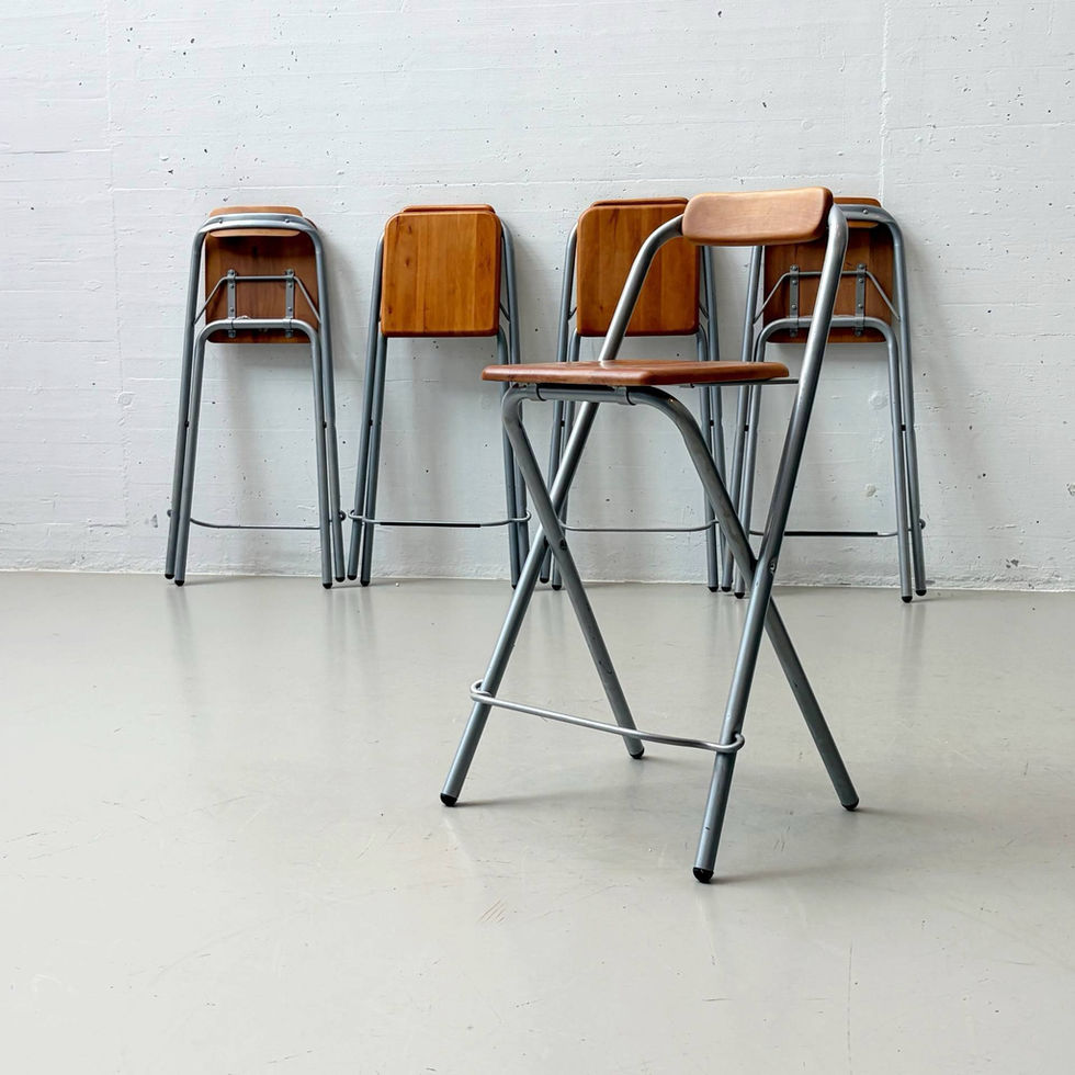 Die Hocker befinden sich in einem sehr guten, gepflegten Vintage-Zustand mit altersgemässen Gebrauchsspuren. Die Holzflächen zeigen eine gleichmässige, warme Patina, die Metallgestelle leichte, oberflächliche Kratzer und minimale Lackabplatzer. Die Klappmechanik funktioniert einwandfrei, die Konstruktion ist stabil und voll einsatzfähig.