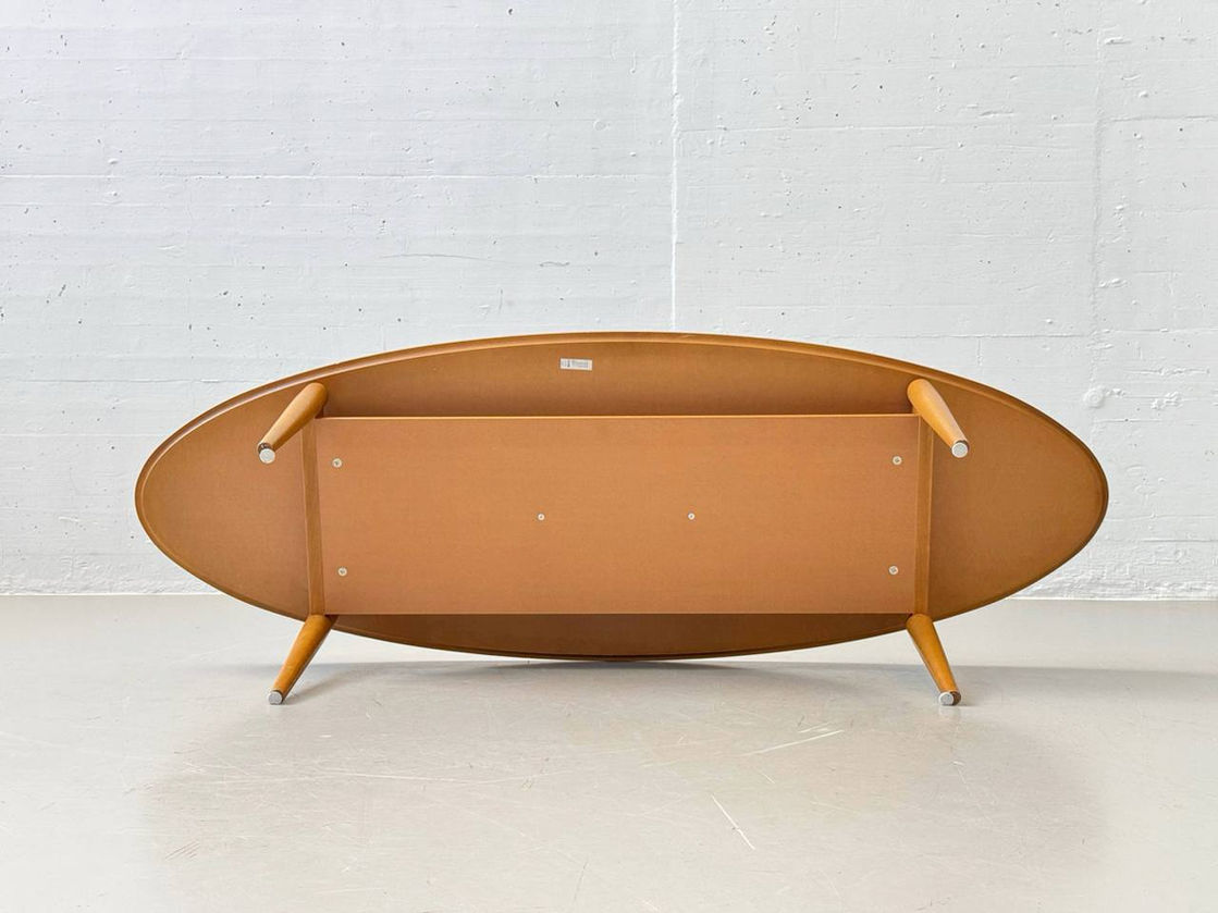Eleganter Couchtisch aus der frühen IKEA Stockholm Kollektion, produziert in Slowenien und datiert auf 1999. Die charakteristische elliptische Tischplatte ist in warmem Eichenfurnier ausgeführt und setzt auf eine ruhige, skandinavische Formensprache. Das Gestell mit konischen Beinen in Massivholz erinnert an klassische Danish-Modern Designs und verleiht dem Tisch eine besonders leichte Silhouette. Die offene Ablagefläche unter der Platte ist funktional gestaltet und ideal zur Aufbewahrung von Büchern und Zeitschriften.