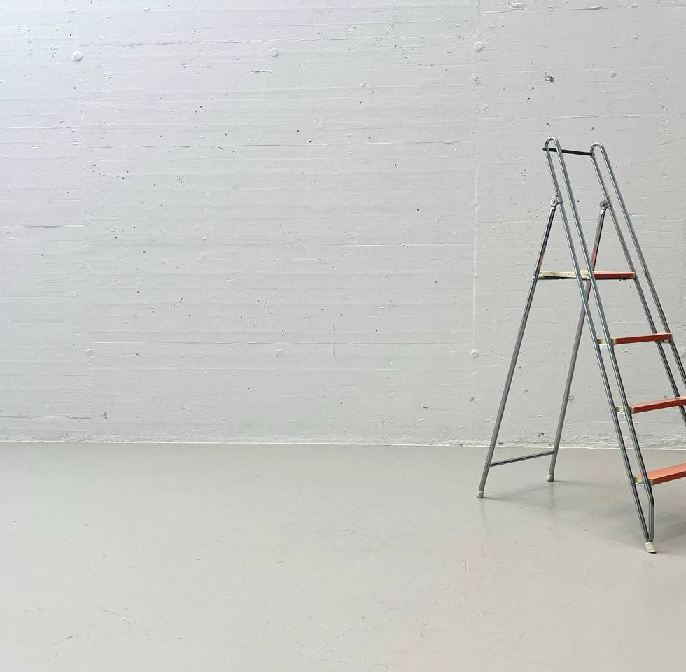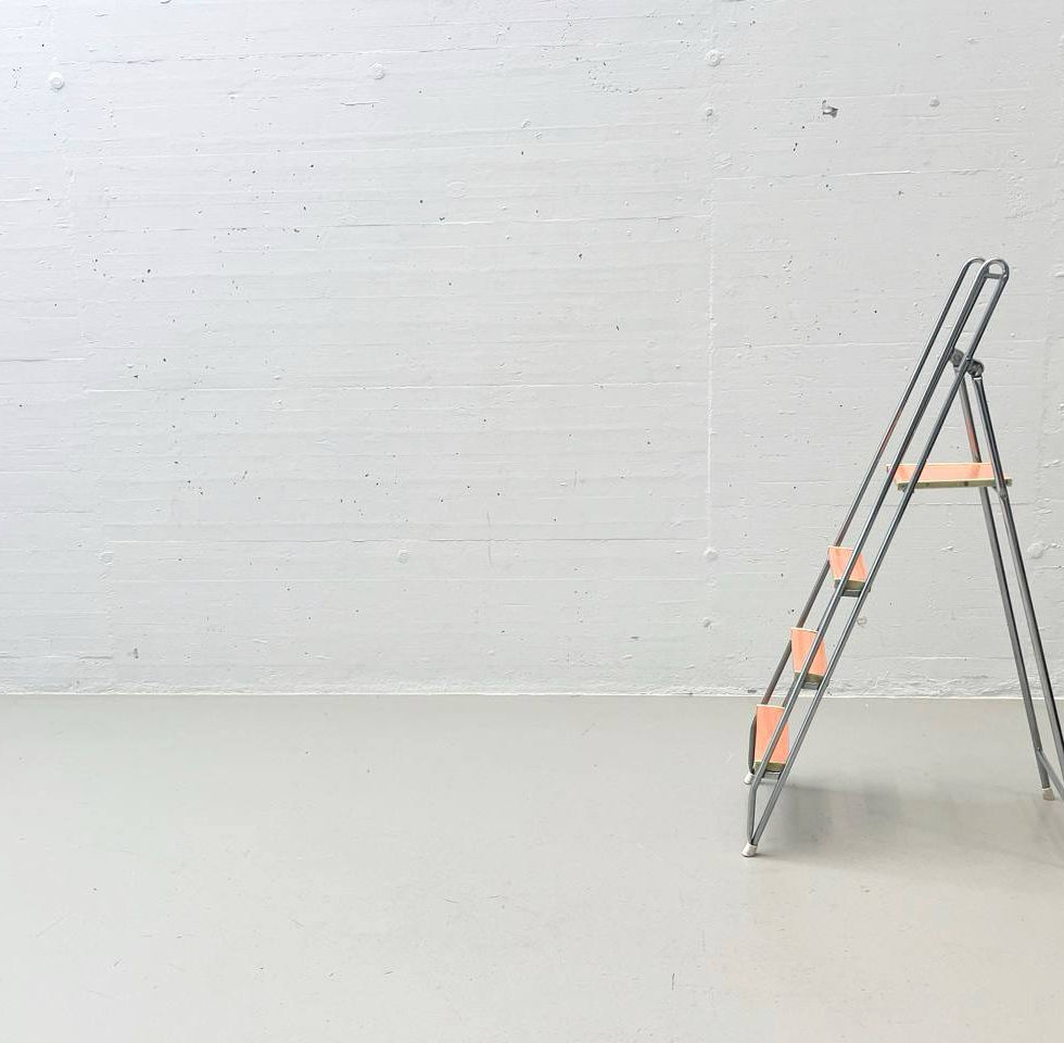 Diese Klappleiter stammt von SCAB Design (Italien) und wurde vermutlich in den 1960er-/70er-Jahren produziert. SCAB war bekannt für die Verbindung von verchromtem Metall und farbigem Kunststoff, ein Materialmix, der für die Nachkriegsmoderne typisch war und bis heute mit italienischem Design der Epoche assoziiert wird.
