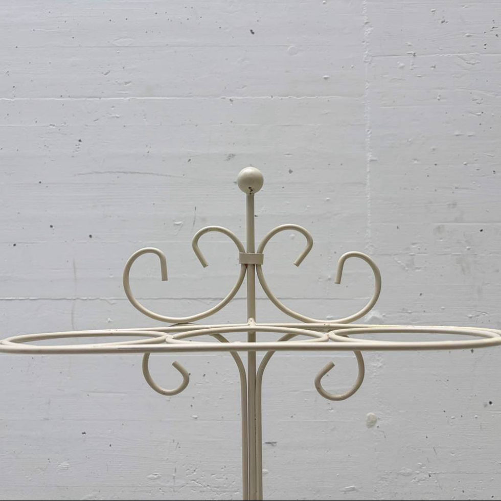 Dekorativer Vintage-Schirmständer aus lackiertem Metall mit filigran geschwungenen Drahtformen und ringförmiger Halterung im oberen Bereich. Das verspielte, fast florale Design steht in schönem Kontrast zur funktionalen Tropfschale unten und verleiht dem Objekt einen typischen Mid-Century-Charakter. Ideal für den Eingangsbereich als praktisches und zugleich dekoratives Designobjekt.