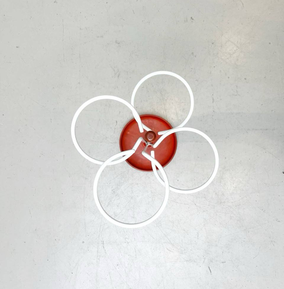Diese sind leicht versetzt angeordnet, wodurch der Schirmständer eine dynamische, fast skulpturale Wirkung erhält. Der Standfuss ist ein schweres, rundes Gusselement, das mit rotem Kunststoff beschichtet wurde und so für Stabilität und einen farblichen Akzent sorgt. Ergänzt wird das Ganze durch einen roten, lackierten Griffstab in der Mitte, der die vertikale Achse betont und zugleich die Handhabung erleichtert.