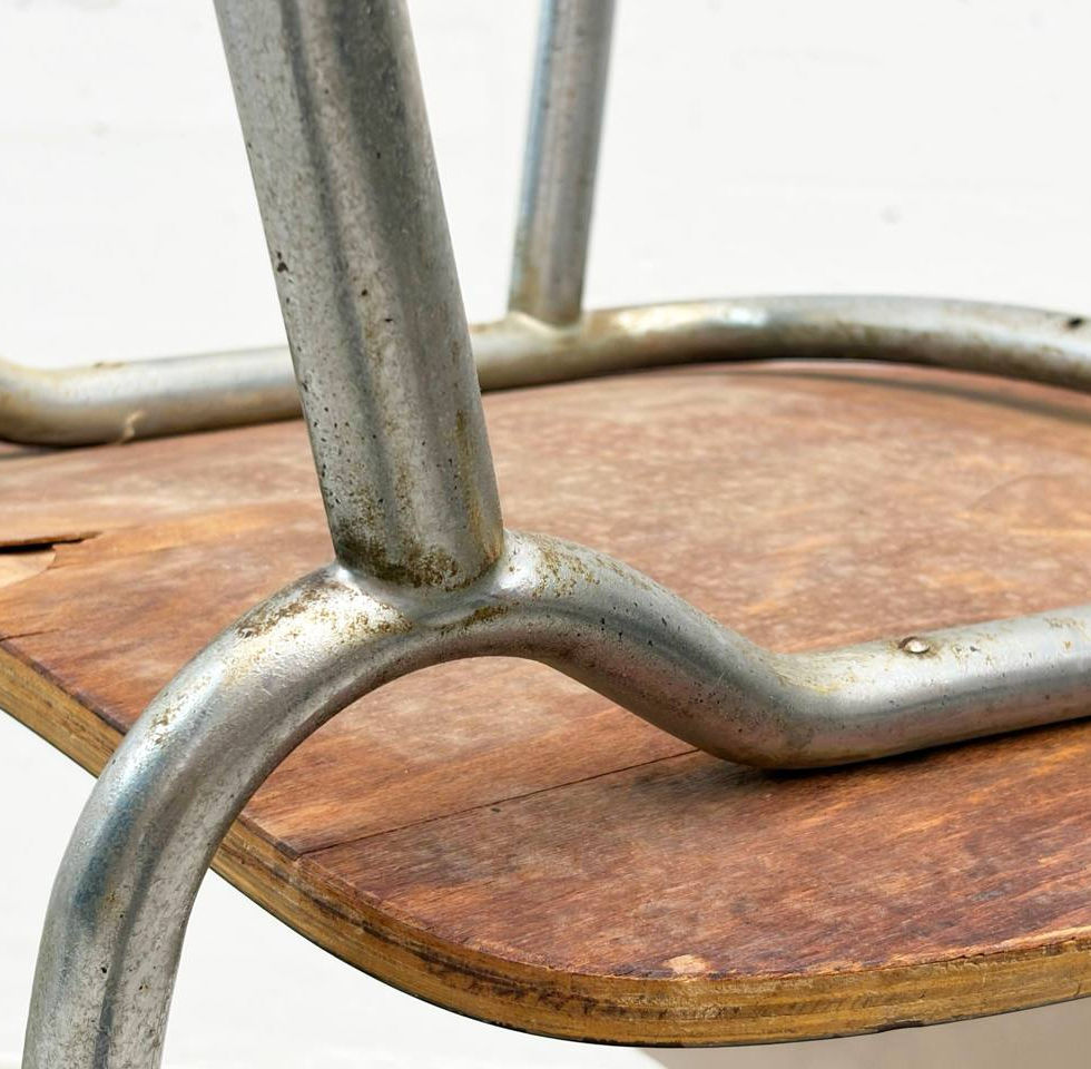 Diese Stühle stammen aus der Mitte des 20. Jahrhunderts und sind typische Vertreter des funktionalen Industriedesigns jener Zeit.