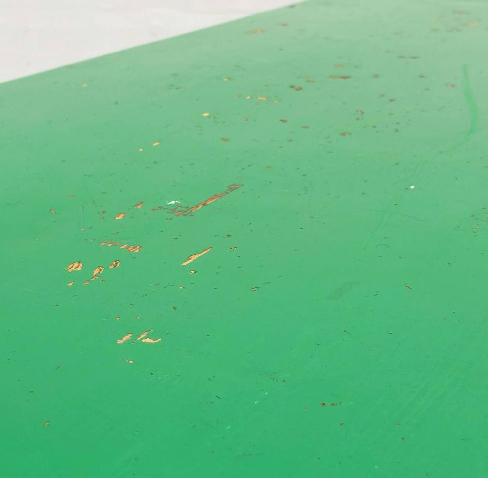 Die grüne Lackierung verleiht dem Tisch einen charaktervollen, beinahe volkstümlichen Ausdruck und hebt die handwerkliche Struktur des Holzes hervor. Besonders an den Kanten und Beinen zeigt sich die Schichtung älterer Lackierungen, was auf eine lange Nutzungsgeschichte hinweist. Die Unterseite offenbart die solide Holzkonstruktion mit sichtbaren handwerklichen Verbindungen.